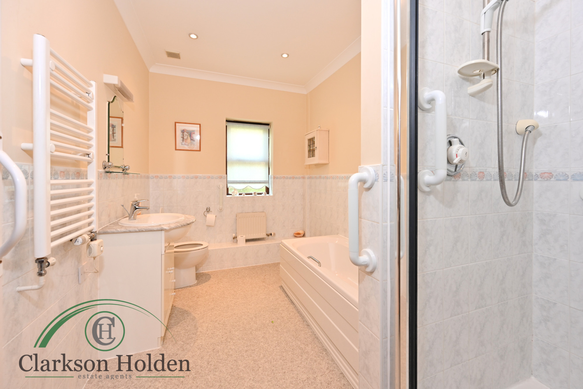 This spacious double bedroom presents a comfortable environment to retire to after a busy day. The adjoining en-suite bathroom which also has access from the gallery features a low level WC together with a separate walk-in shower cubicle and bath, with single rounded basin mounted on a built-in storage cupboard. The room also benefits from a wall-mounted heated towel rail.