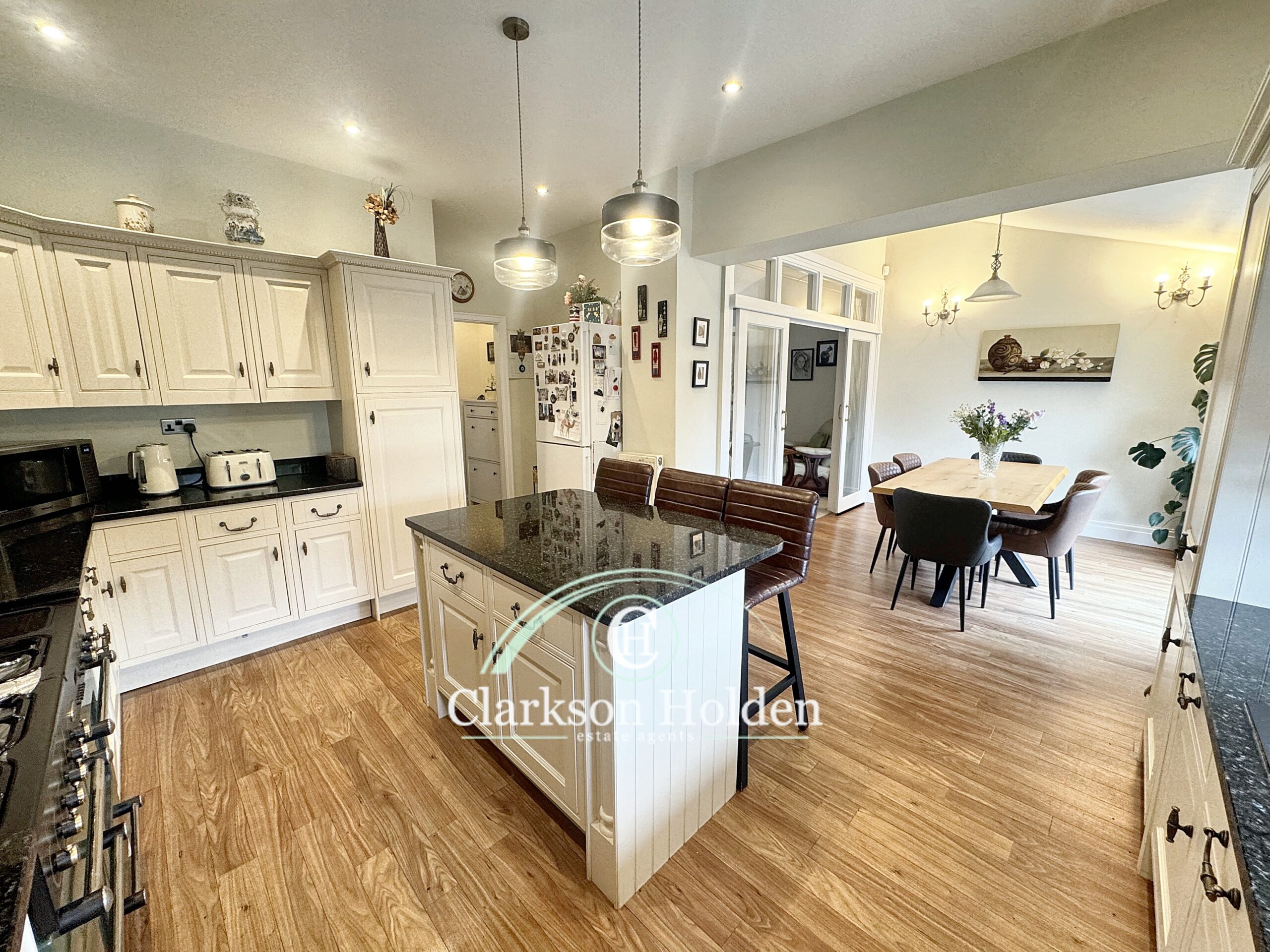 Stepping inside, the highlight of the home is the stunning open plan kitchen/diner featuring a Rangemaster Aga, perfect for both every-day living and entertaining guests. This space seamlessly flows into two separate reception rooms, providing flexibility for different living arrangements.