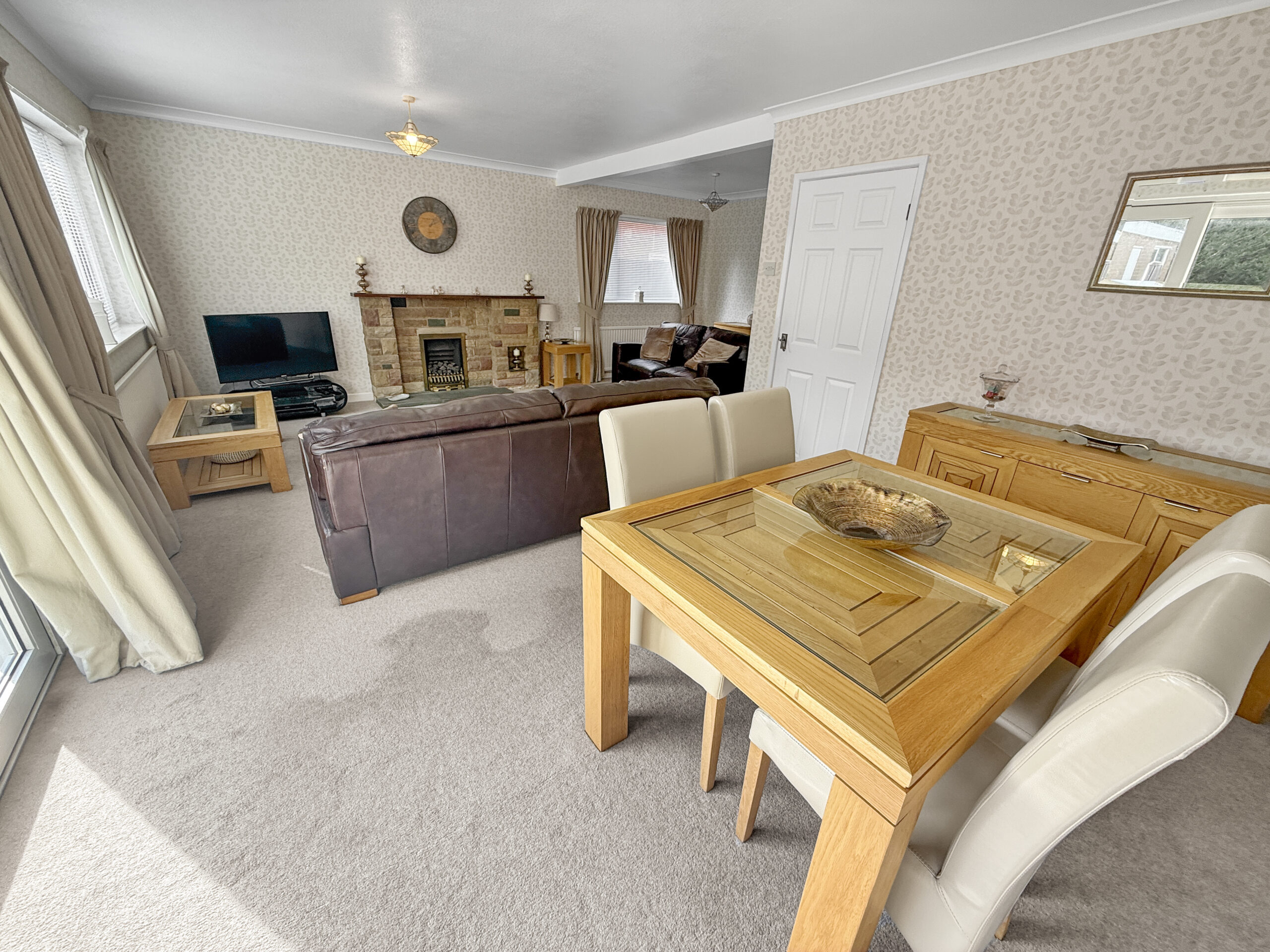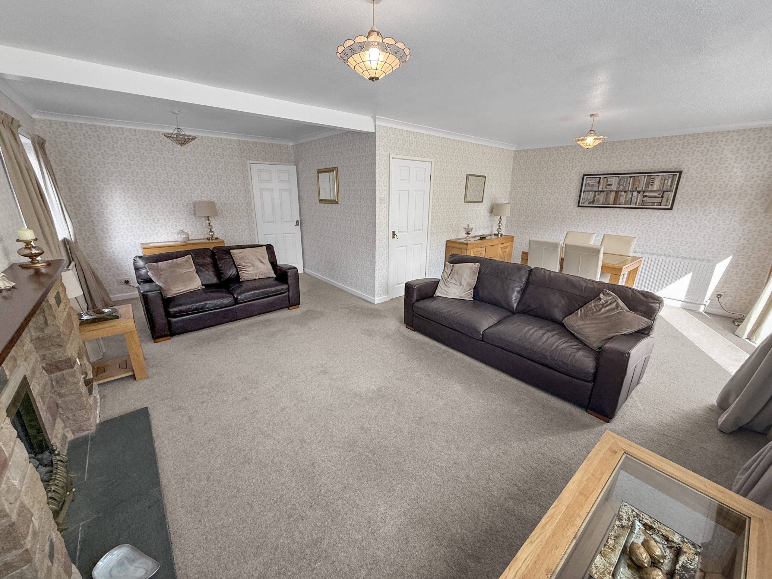 Inside, the accommodation is generously proportioned, with an open-plan, L-shaped lounge and diner that creates a welcoming and versatile living space, enhanced by sliding doors that fill the room with natural light and offer pleasant views.