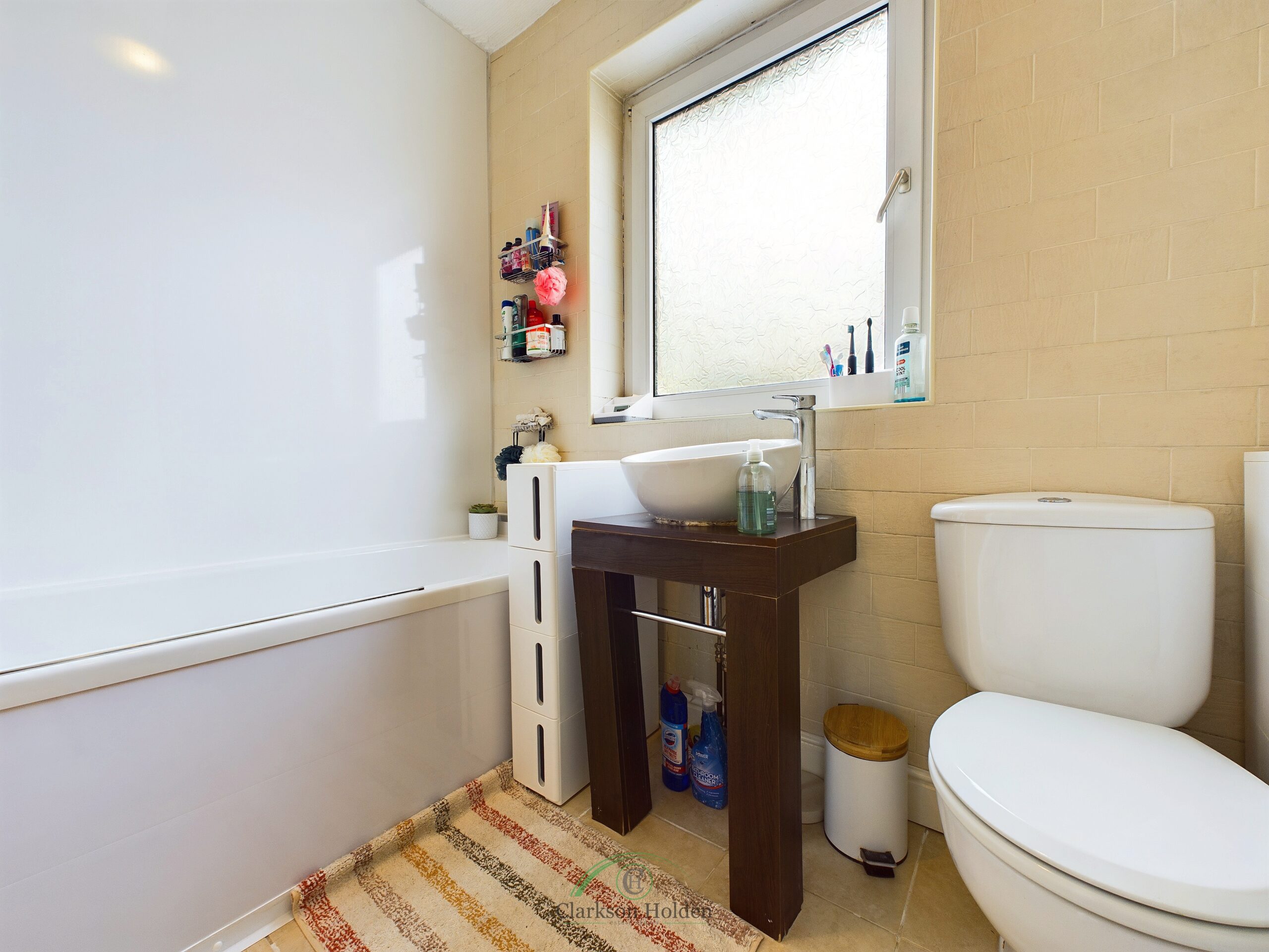 Three piece bathroom suite comprising white panelled bath with overhead shower, hand wash basin, low flush WC, opaque UPVC double glazed window to the rear elevation.