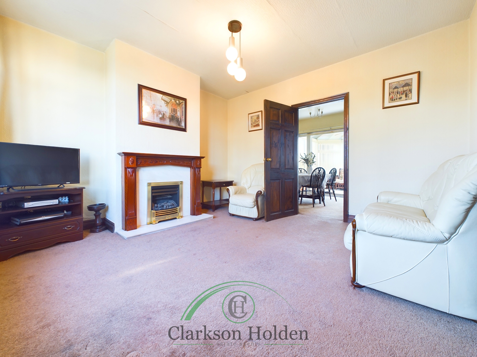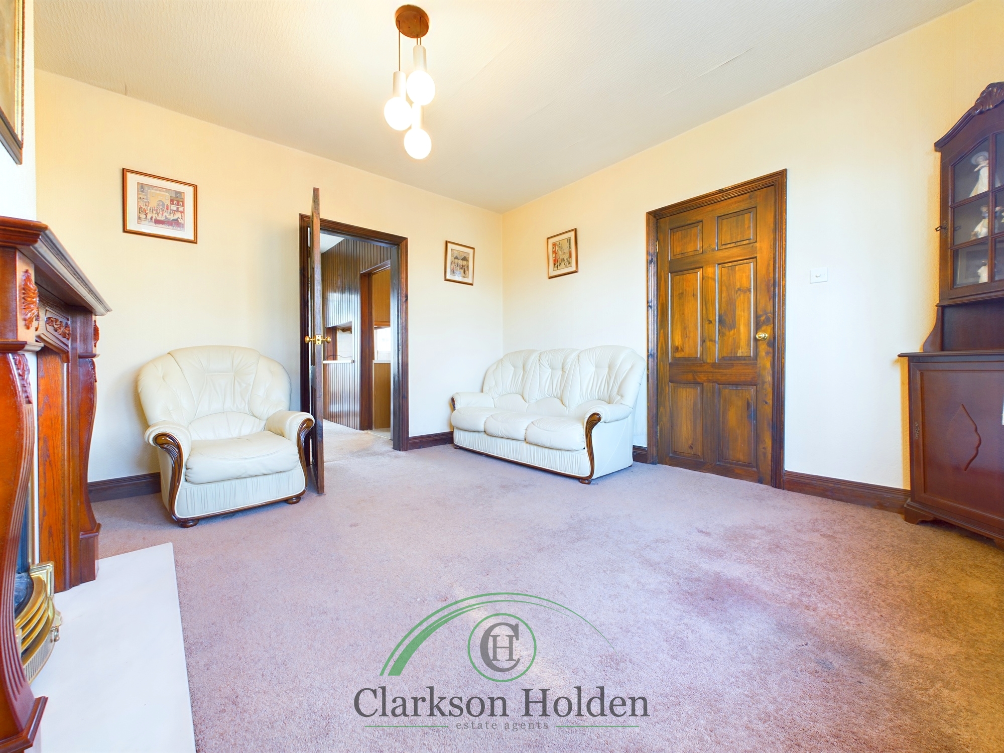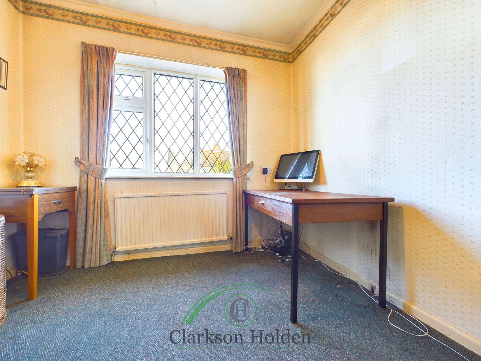 UPVC double glazed window to the front elevation, carpeted flooring, ,electric fireplace with oak mantelpiece, large window with fitted curtain rail, radiator.
