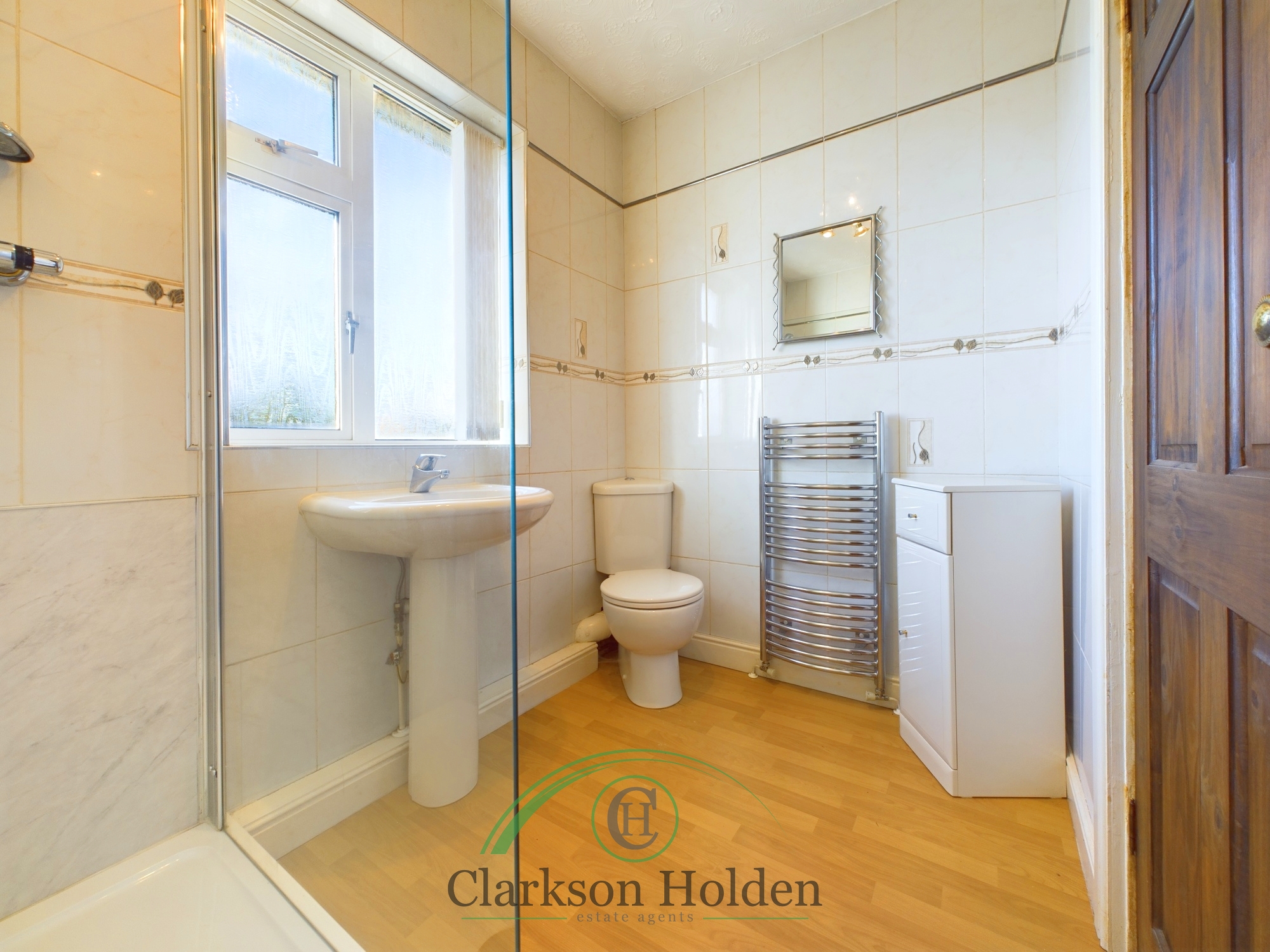Tiled three piece shower room suite comprising shower cubicle, low flush WC, pedestal hand wash basin, UPVC double glazed opaque window to the rear elevation.