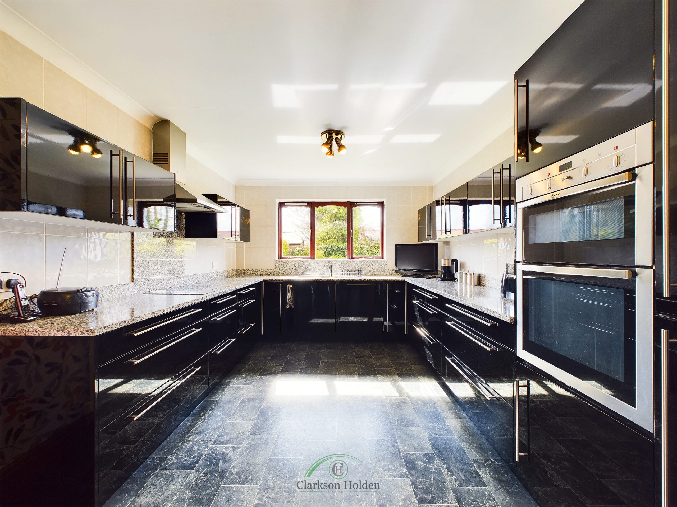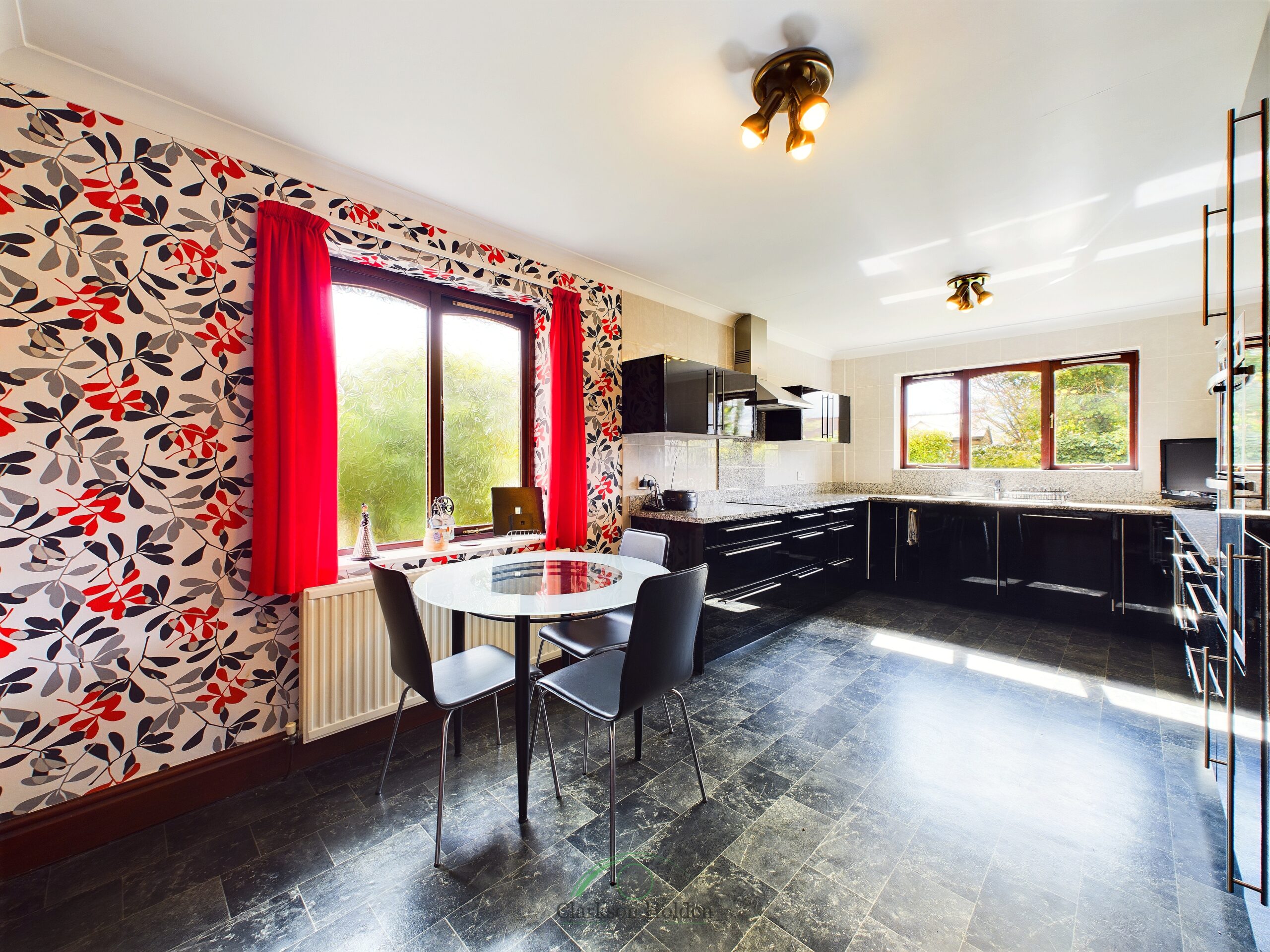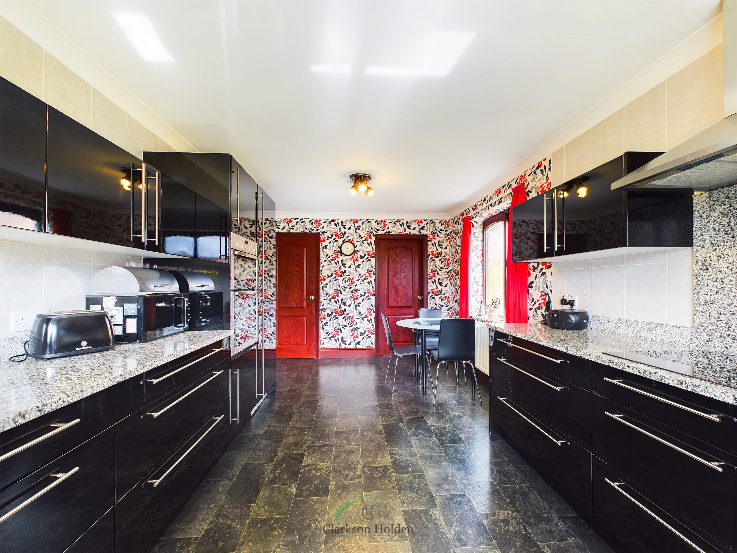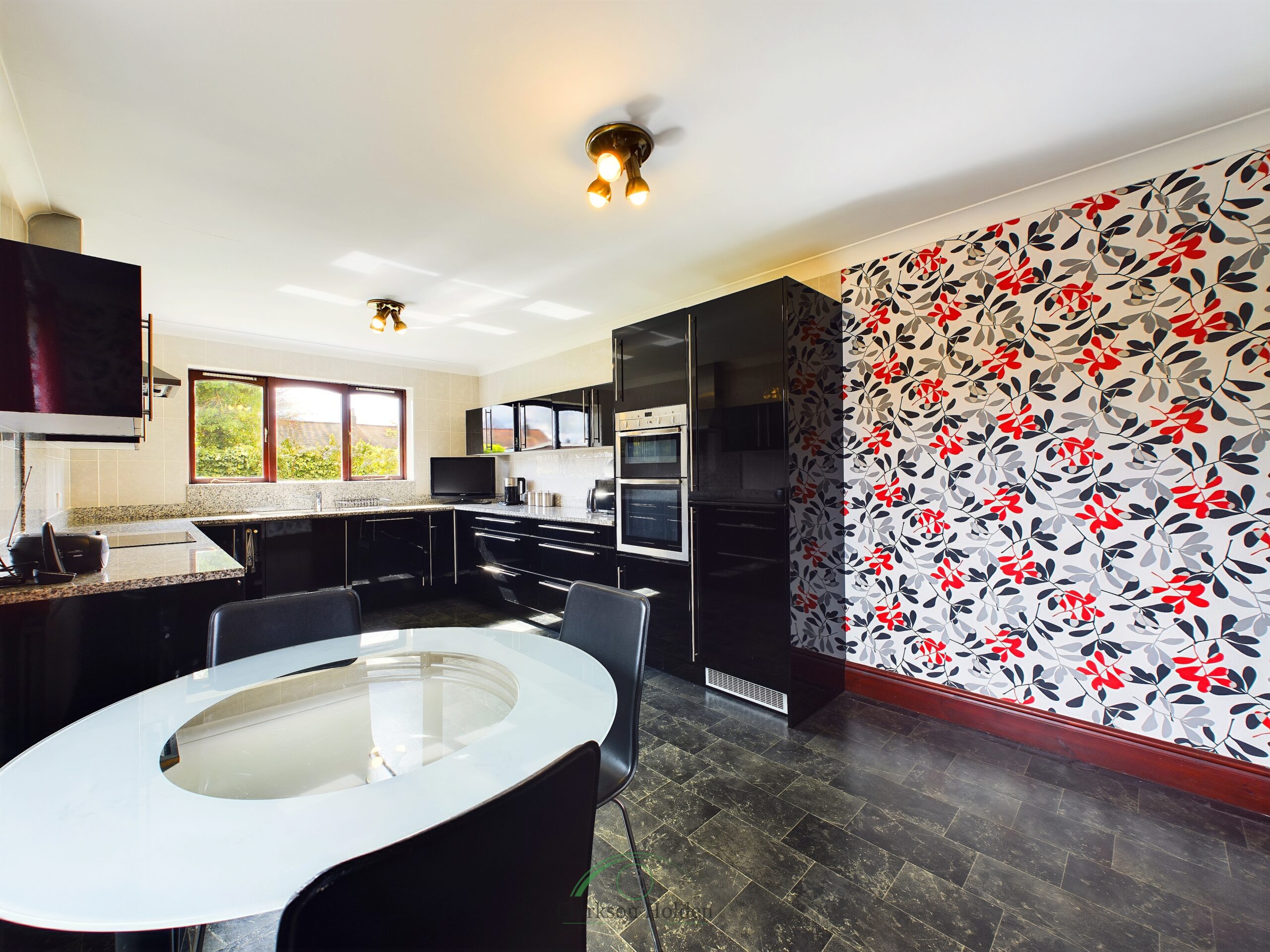 Fitted with a matching range of modern gloss black base and wall units, integrated fridge freezer, dishwasher, double oven, four ring hob with extractor hood over. Double glazed windows to the side and rear elevation. Access to utility room, radiator.
