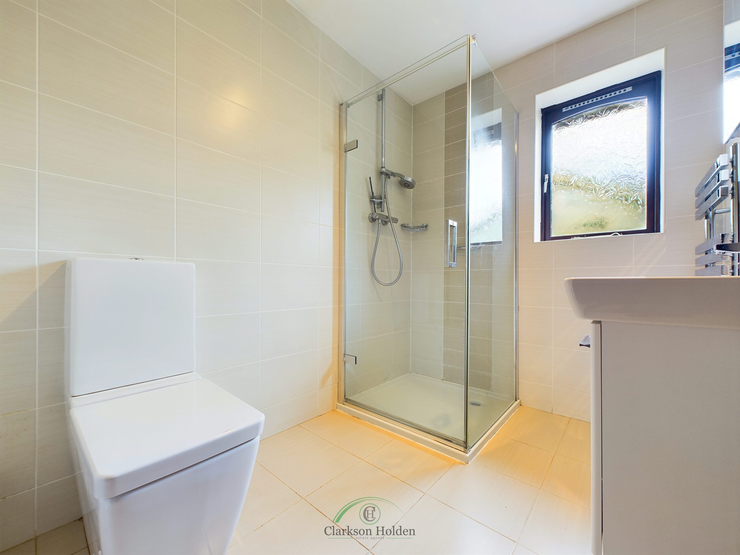 Stylish three piece en-suite shower room, comprising walk in shower, hand wash basin with underneath storage, low flush WC, double glazed opaque window to the side elevation, heated towel rail.