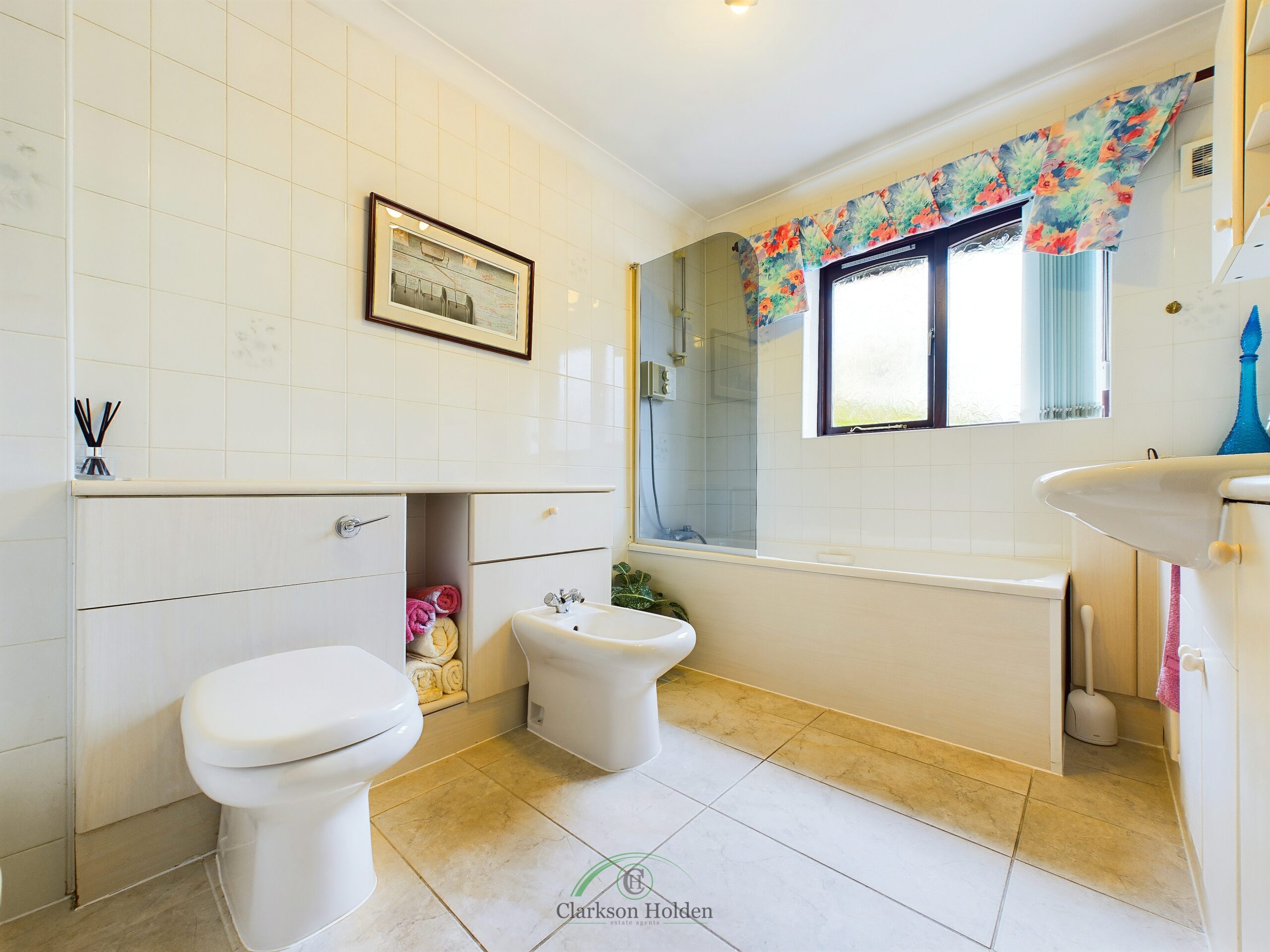 Three piece bathroom suite comprising white panelled bath with overhead shower, low flush WC, bidet, wall mounted hand wash basin, heated towel rail.