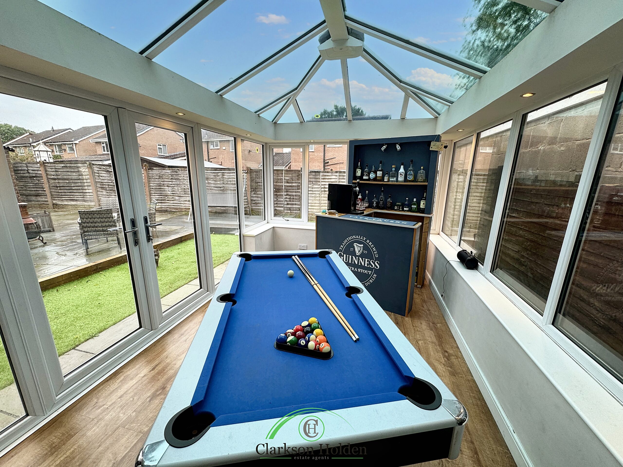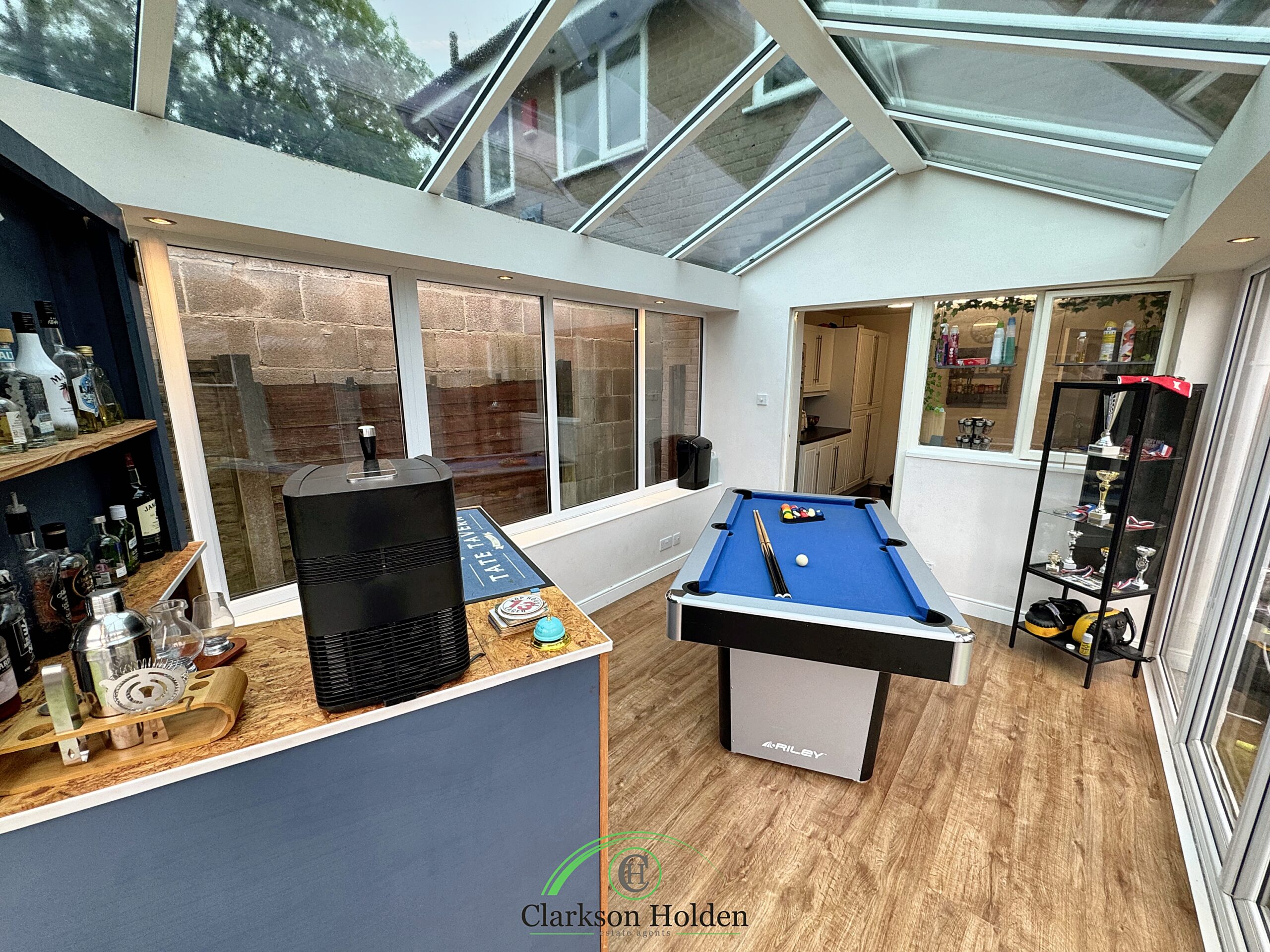 As you step inside, you'll immediately notice the beautiful, large conservatory that is flooded with natural light, creating a warm and inviting atmosphere. The conservatory is currently used as a games room/bar - however, this could easily be used as a relaxing space and/or a dining/sun room. The double doors lead out to the patio area, ideal for enjoying al fresco dining on warm summer evenings.
