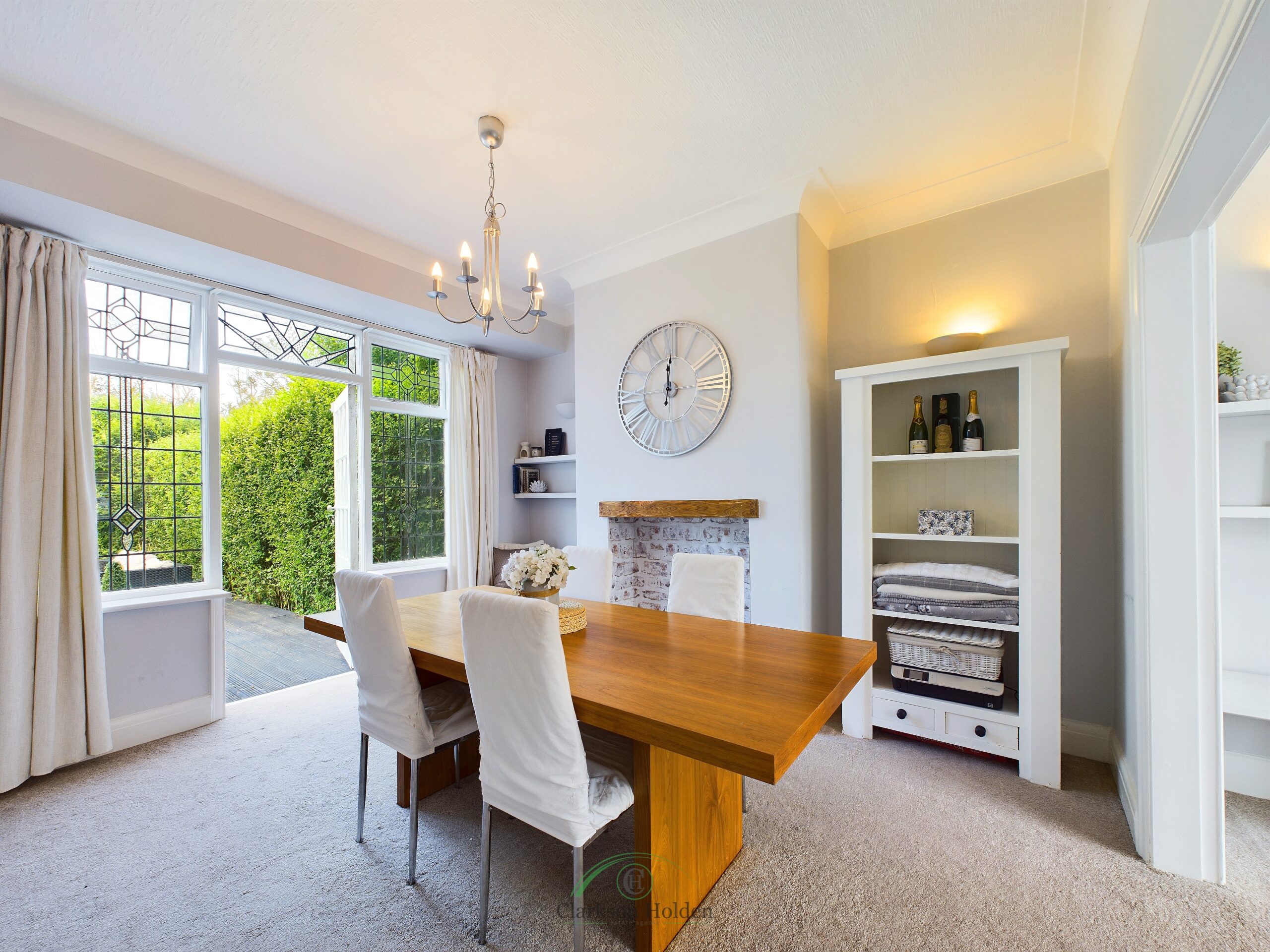 Sunny dining space with original leaded French doors overlooking the rear garden. Open fireplace, Storage seating area and wall shelving.