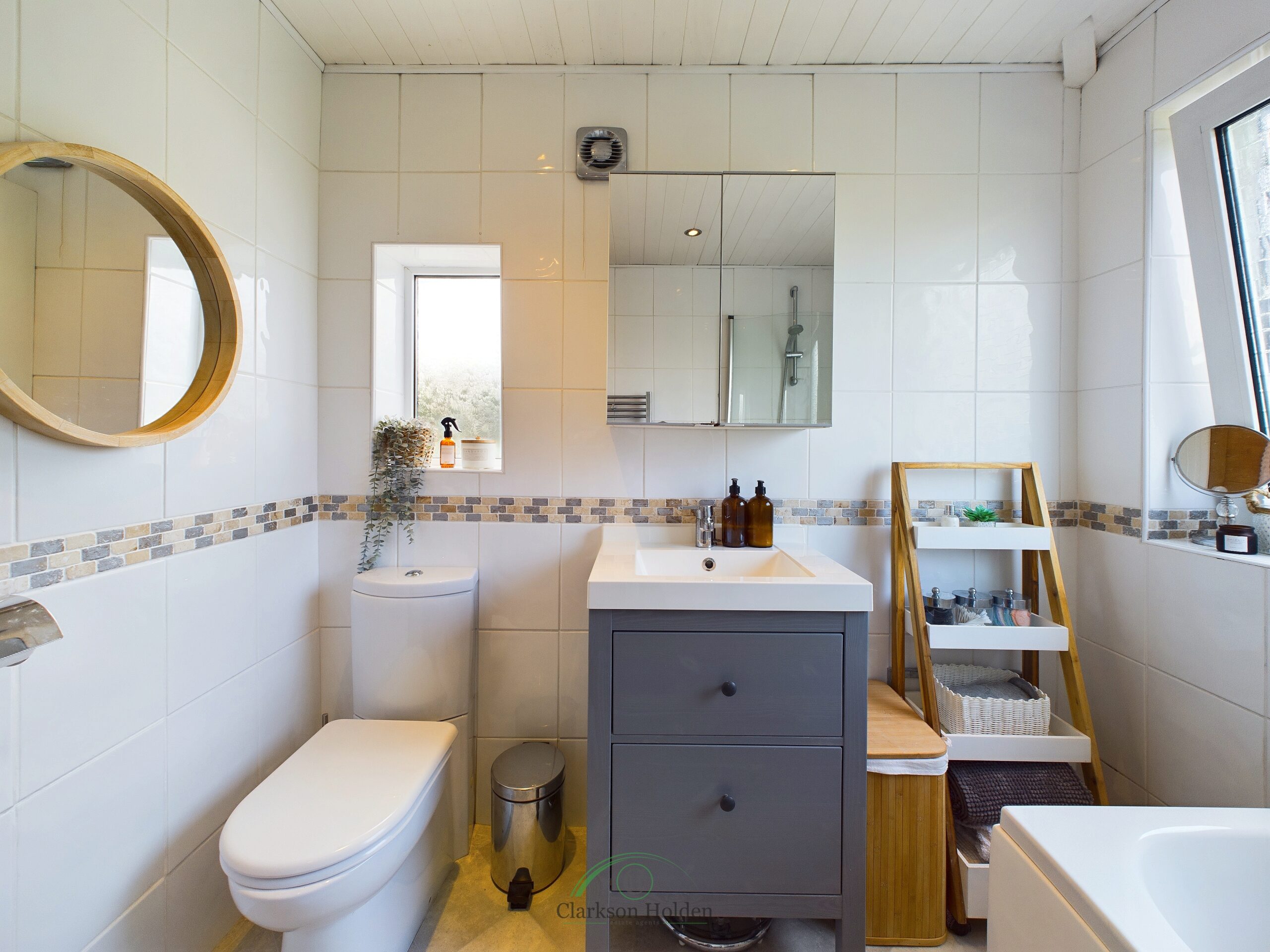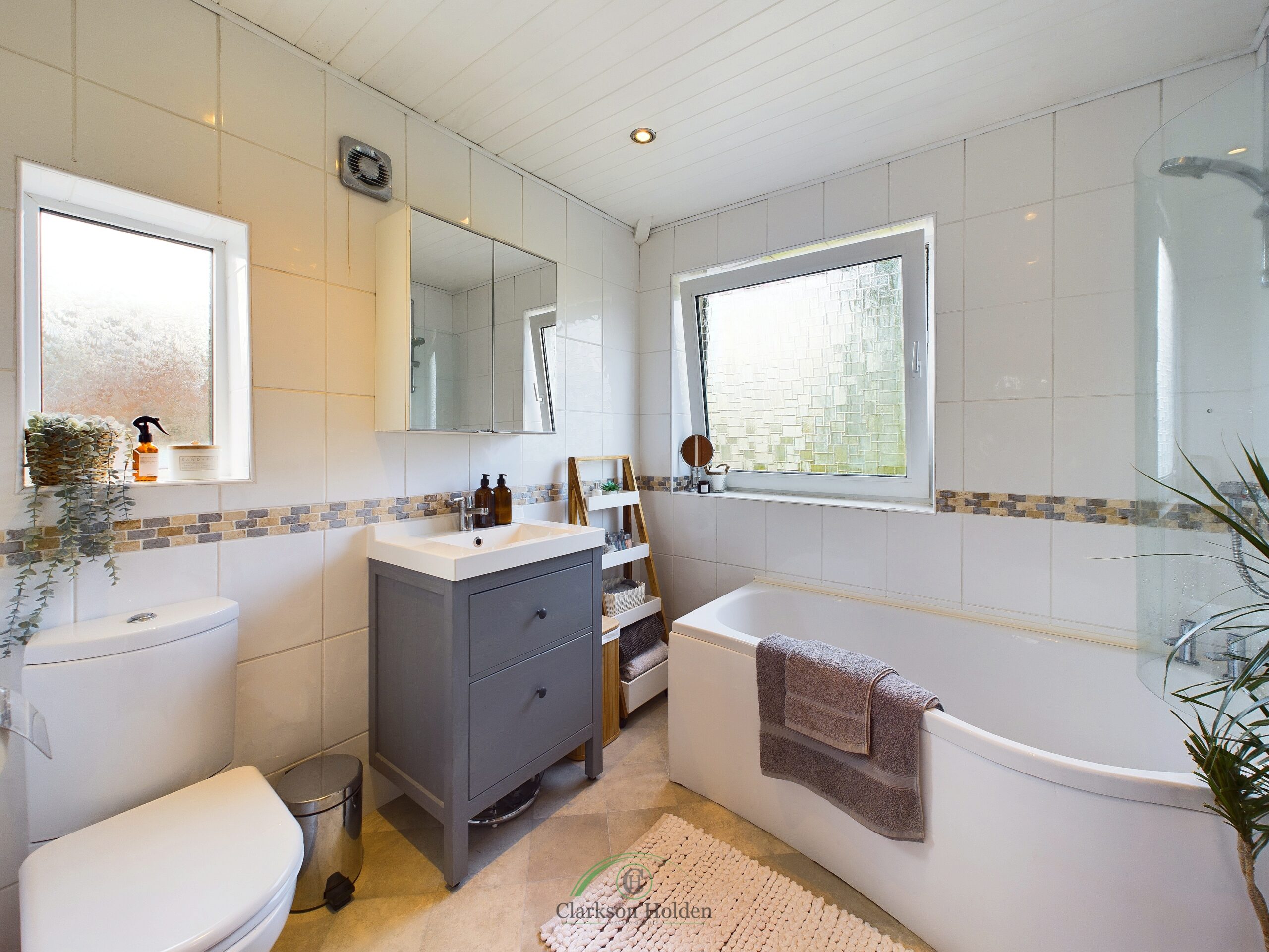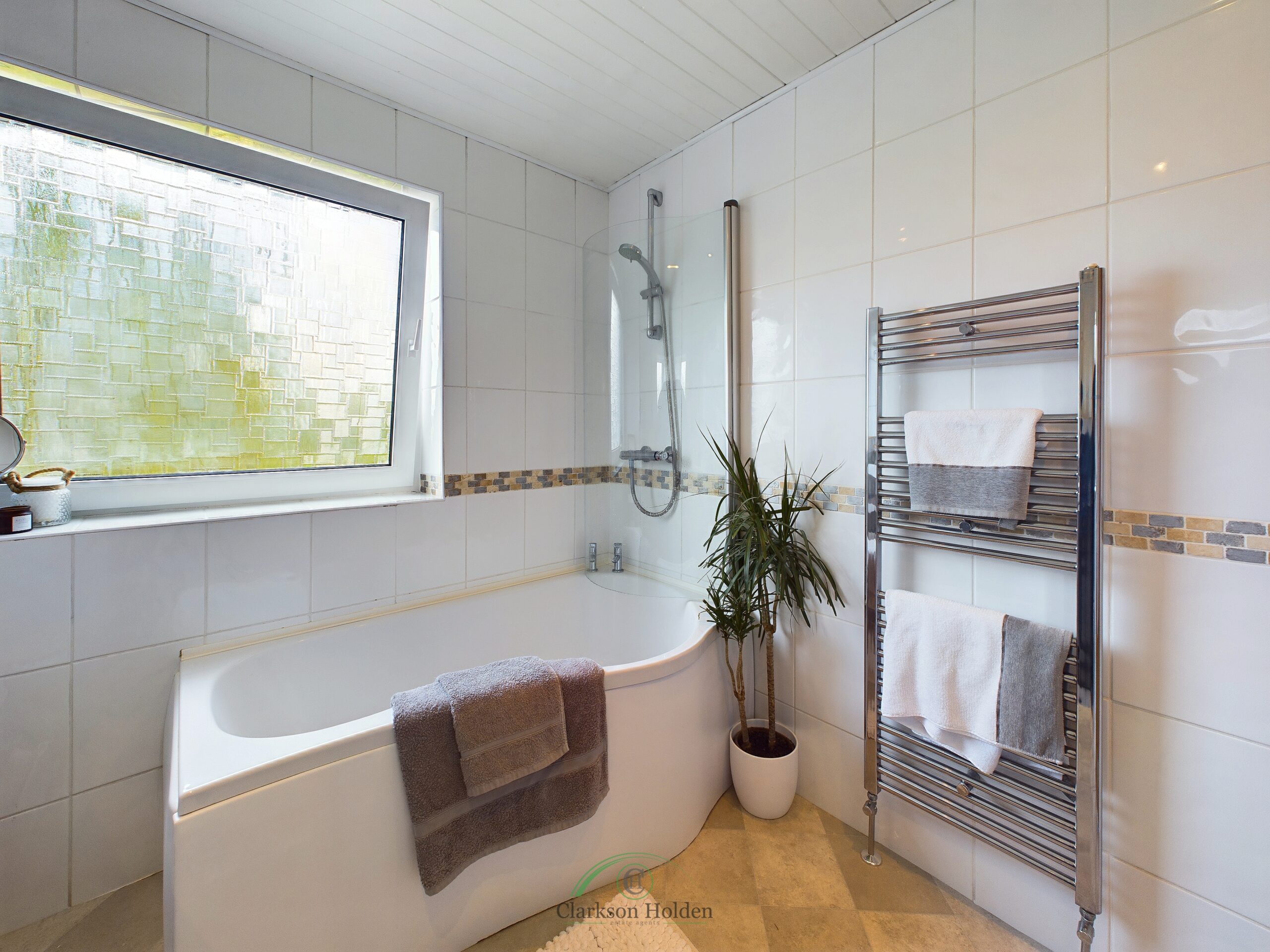 Three piece family bathroom suite comprising, over bath shower, sink with underneath storage, low flush WC. UPVC window to side elevation and upright radiator.