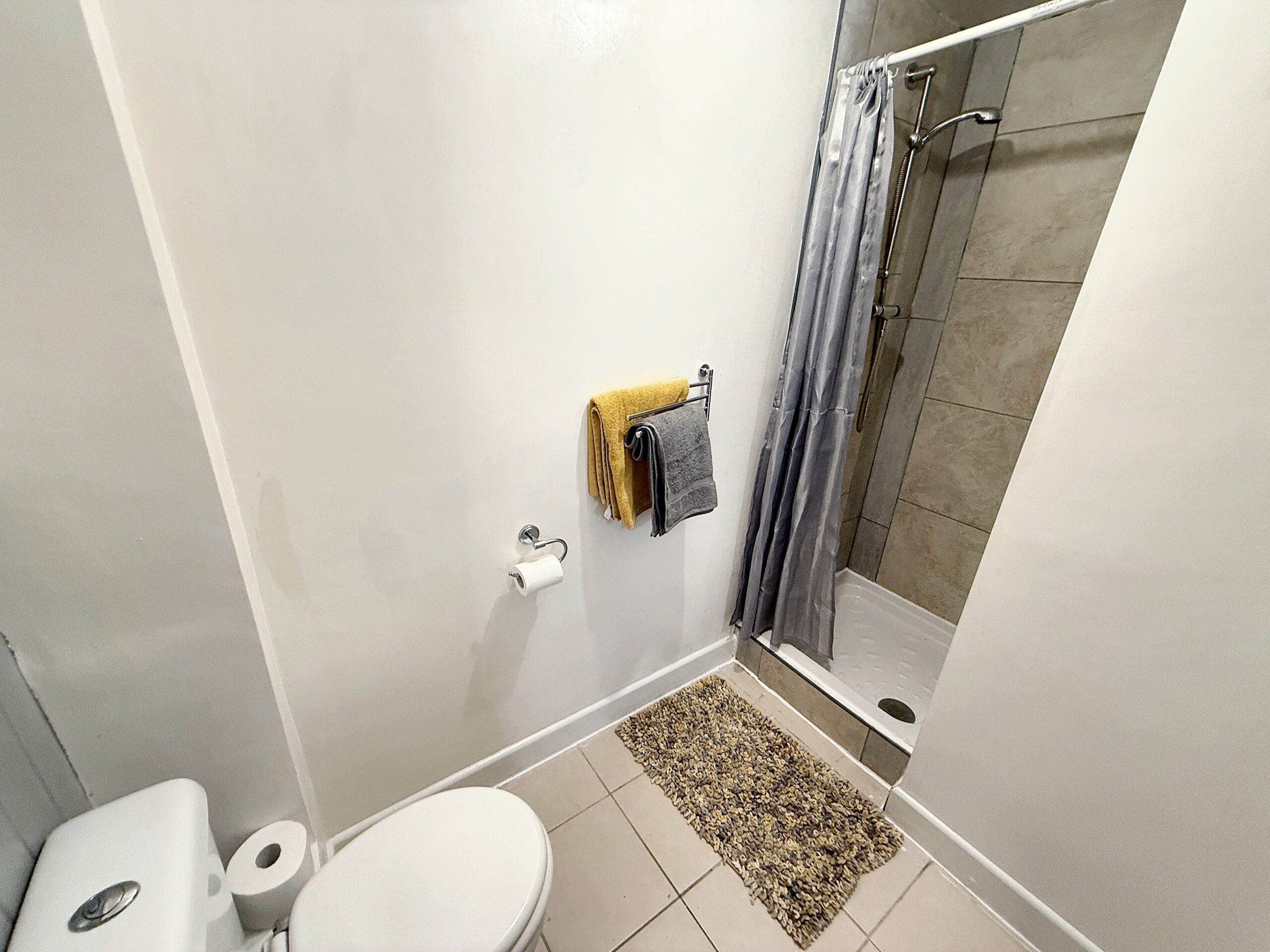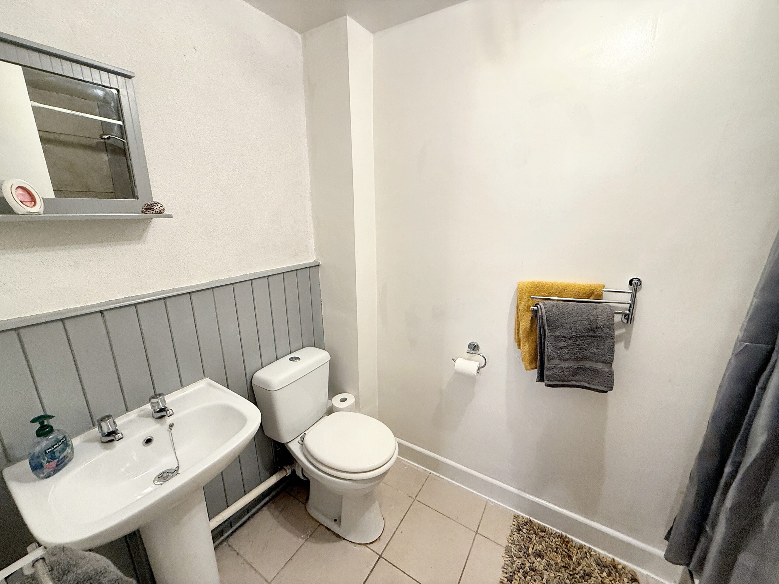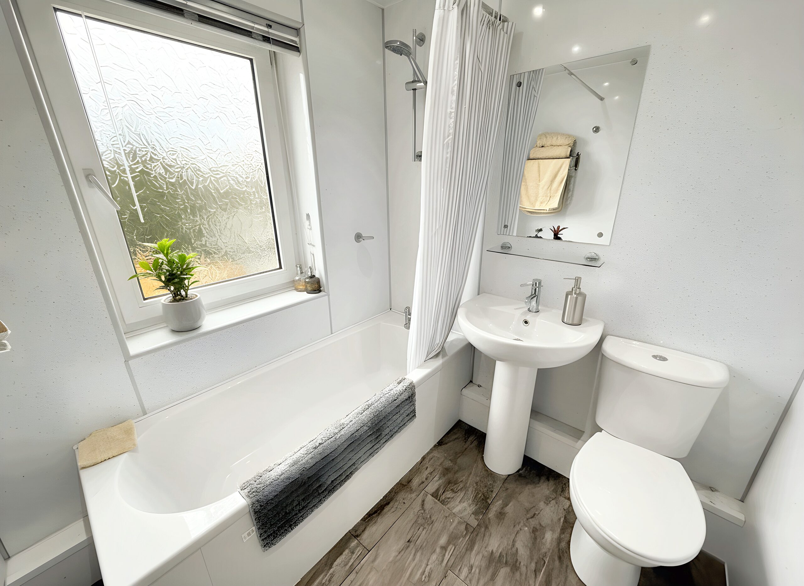 The family bathroom is finished in a contemporary style, featuring a three-piece suite.
