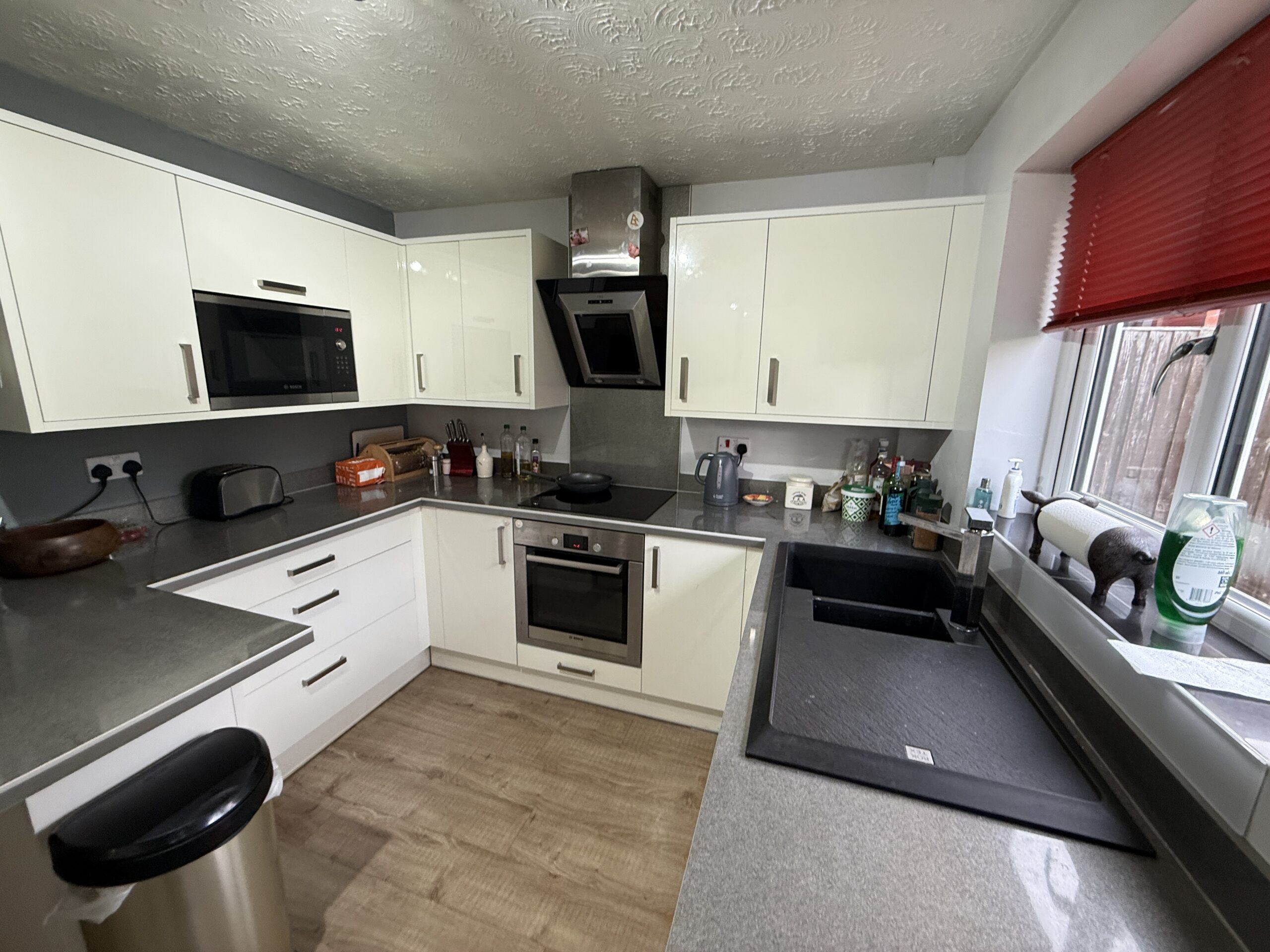 The kitchen is finished to a high standard, featuring contemporary cabinetry, integrated appliances, and ample workspace, while the adjoining dining area creates a sociable heart to the home.