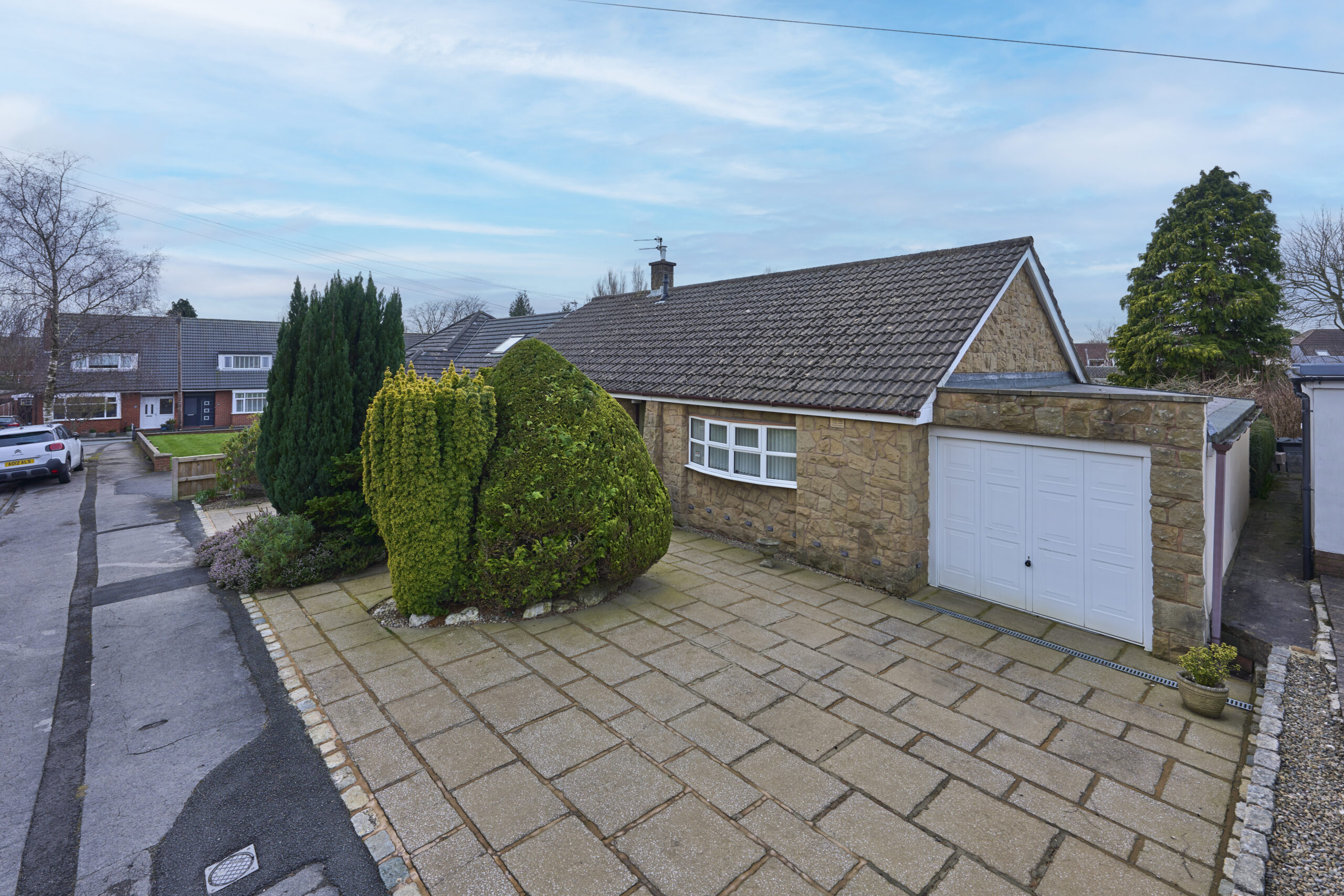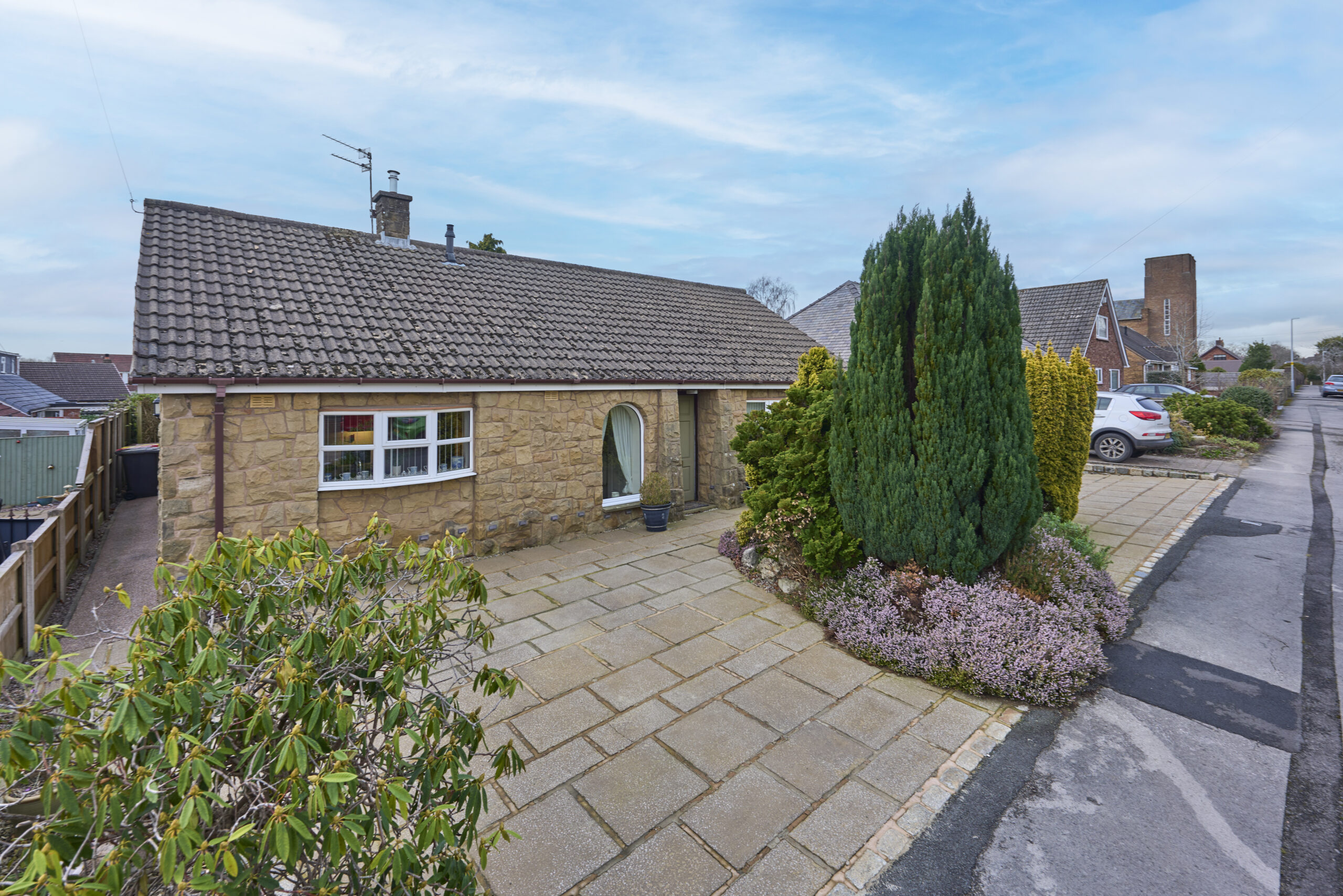 The paved front garden is attractively designed with mature shrubs, enhancing the property's kerb appeal.