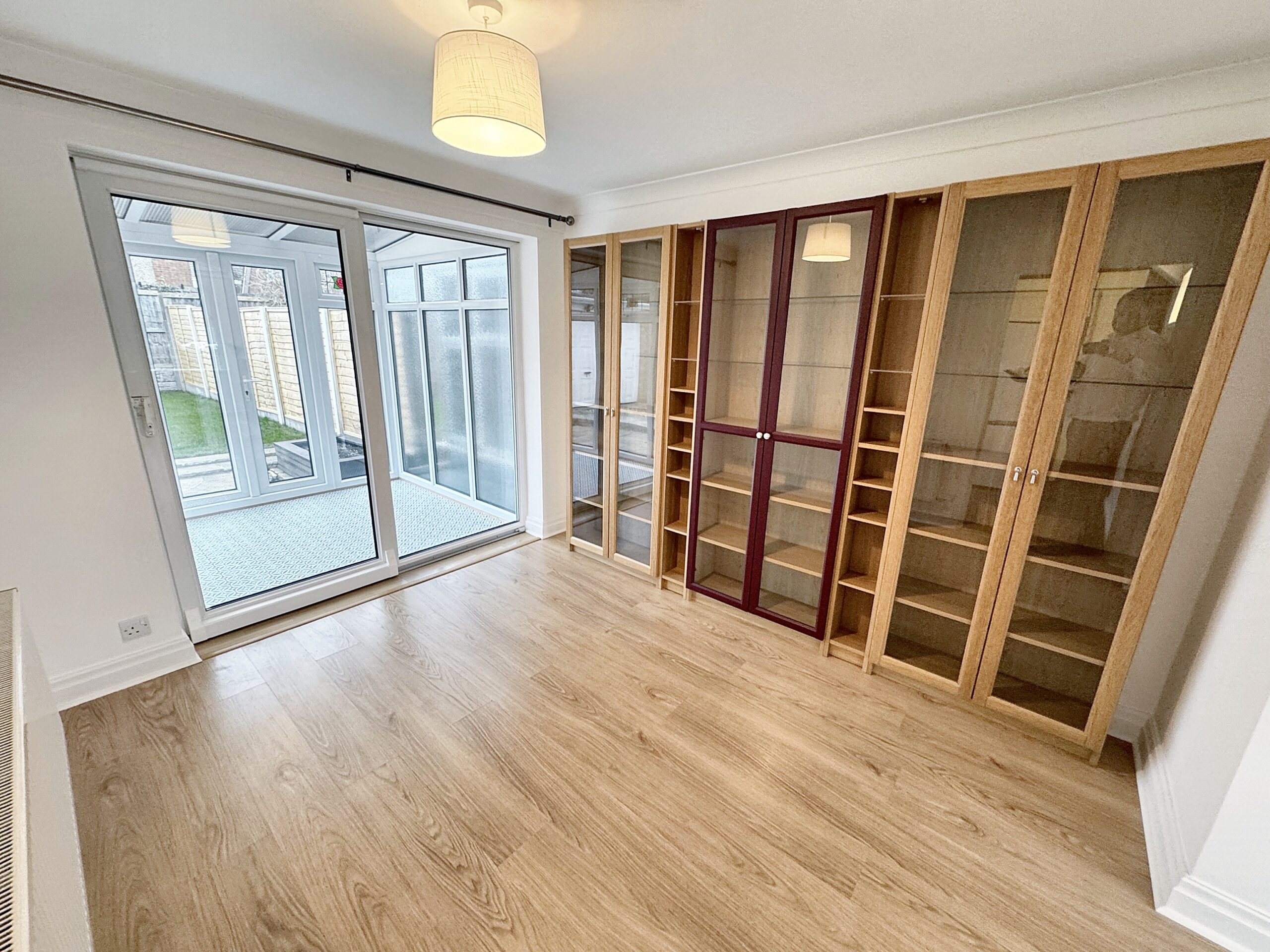 Light airy room with wood effect flooring and fitted glass display cabinets to one wall. Access to kitchen. Radiator. Sliding patio doors leading to a rear conservatory.