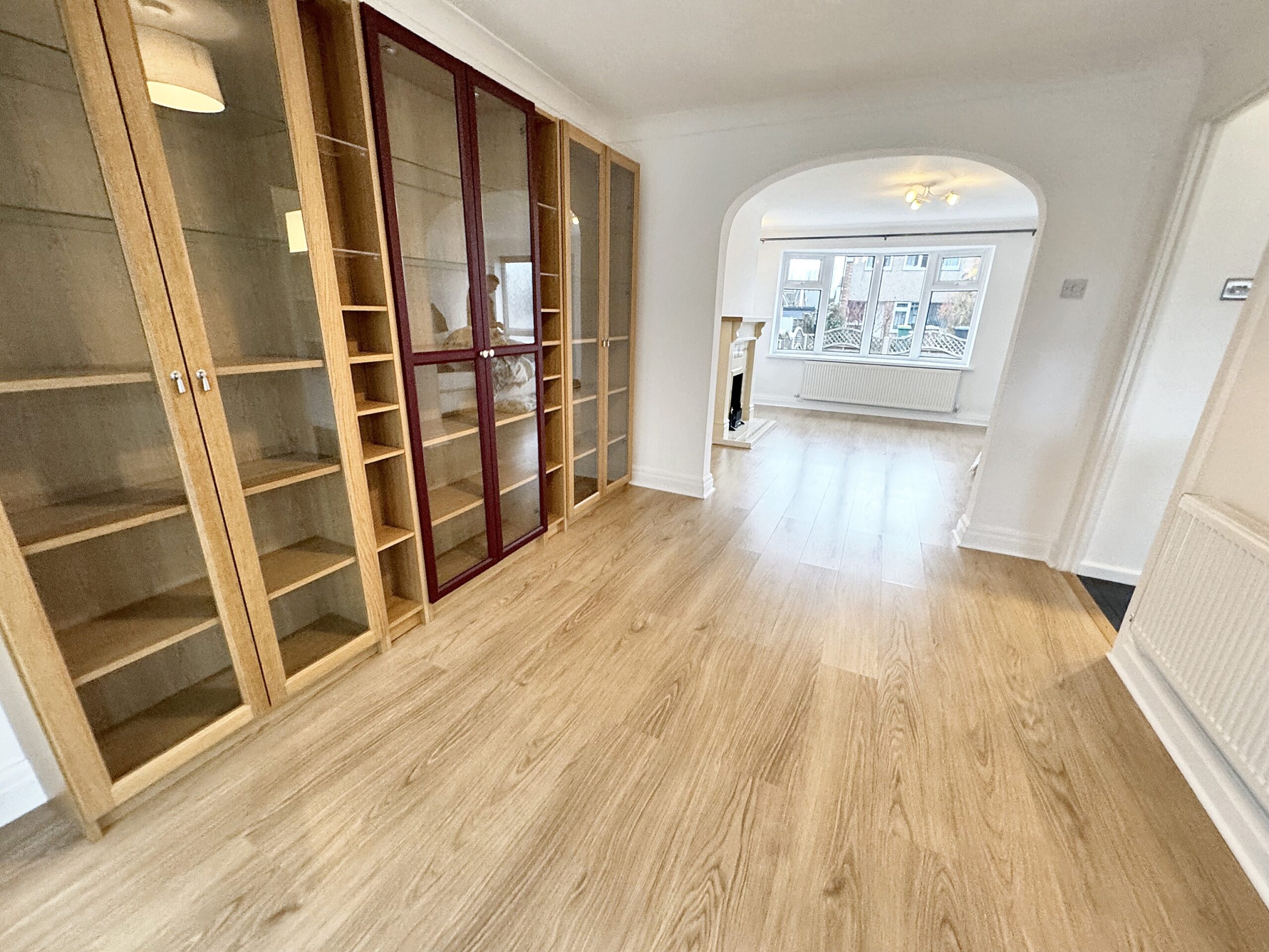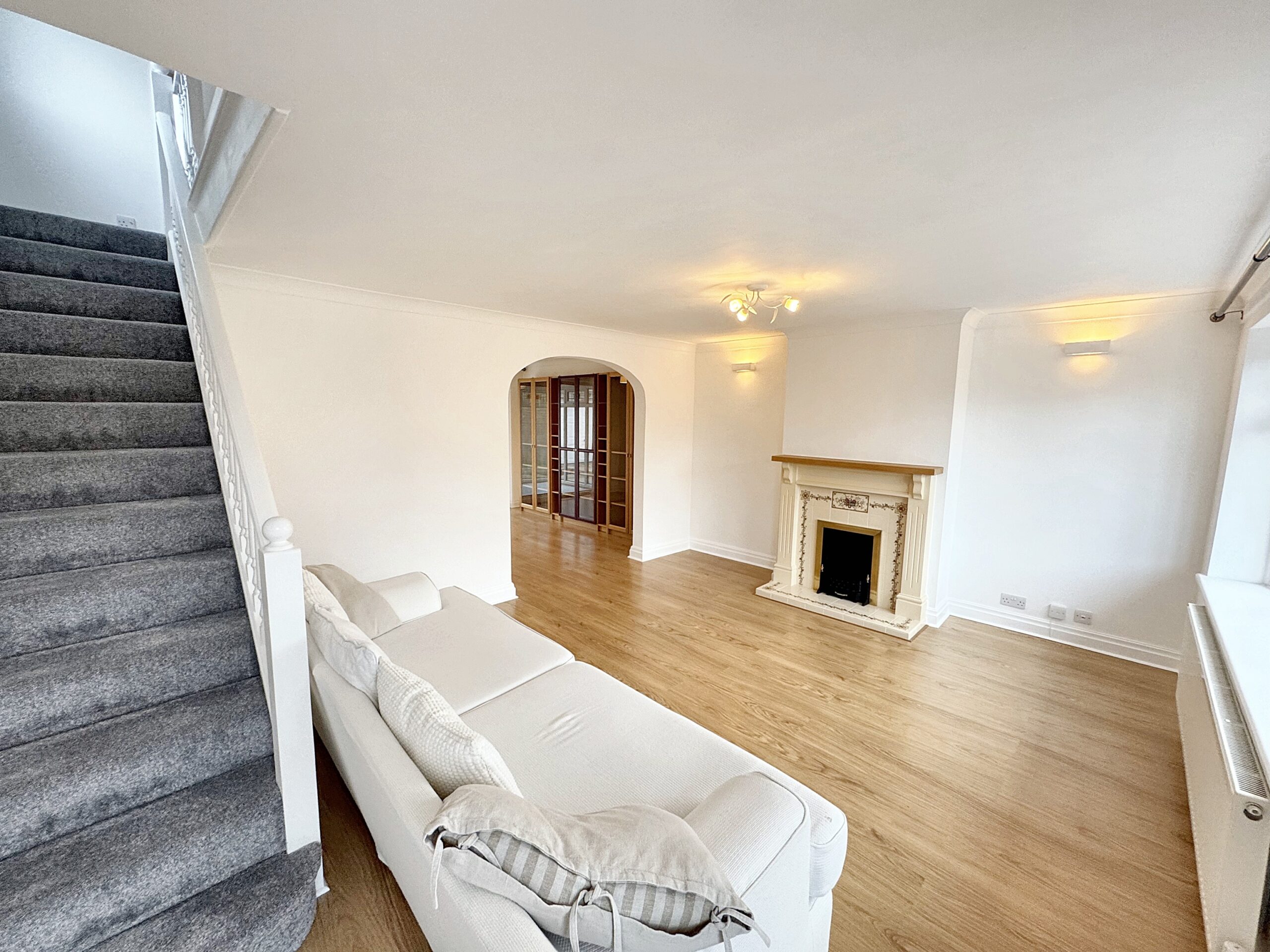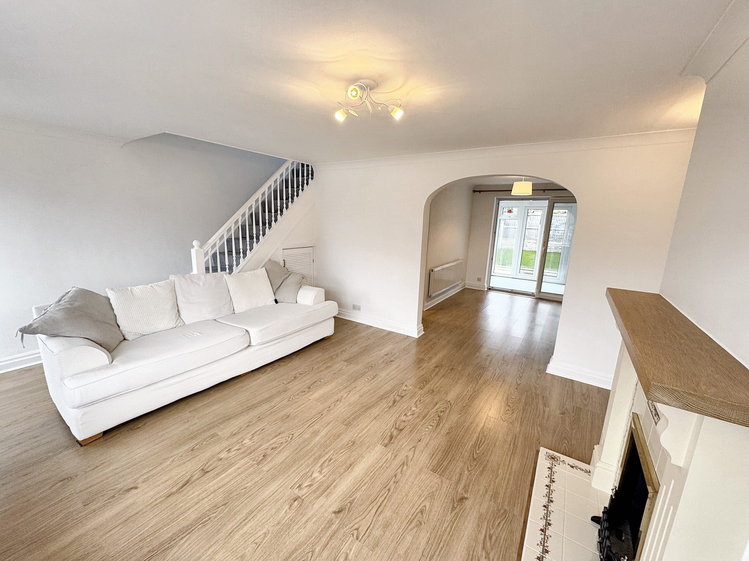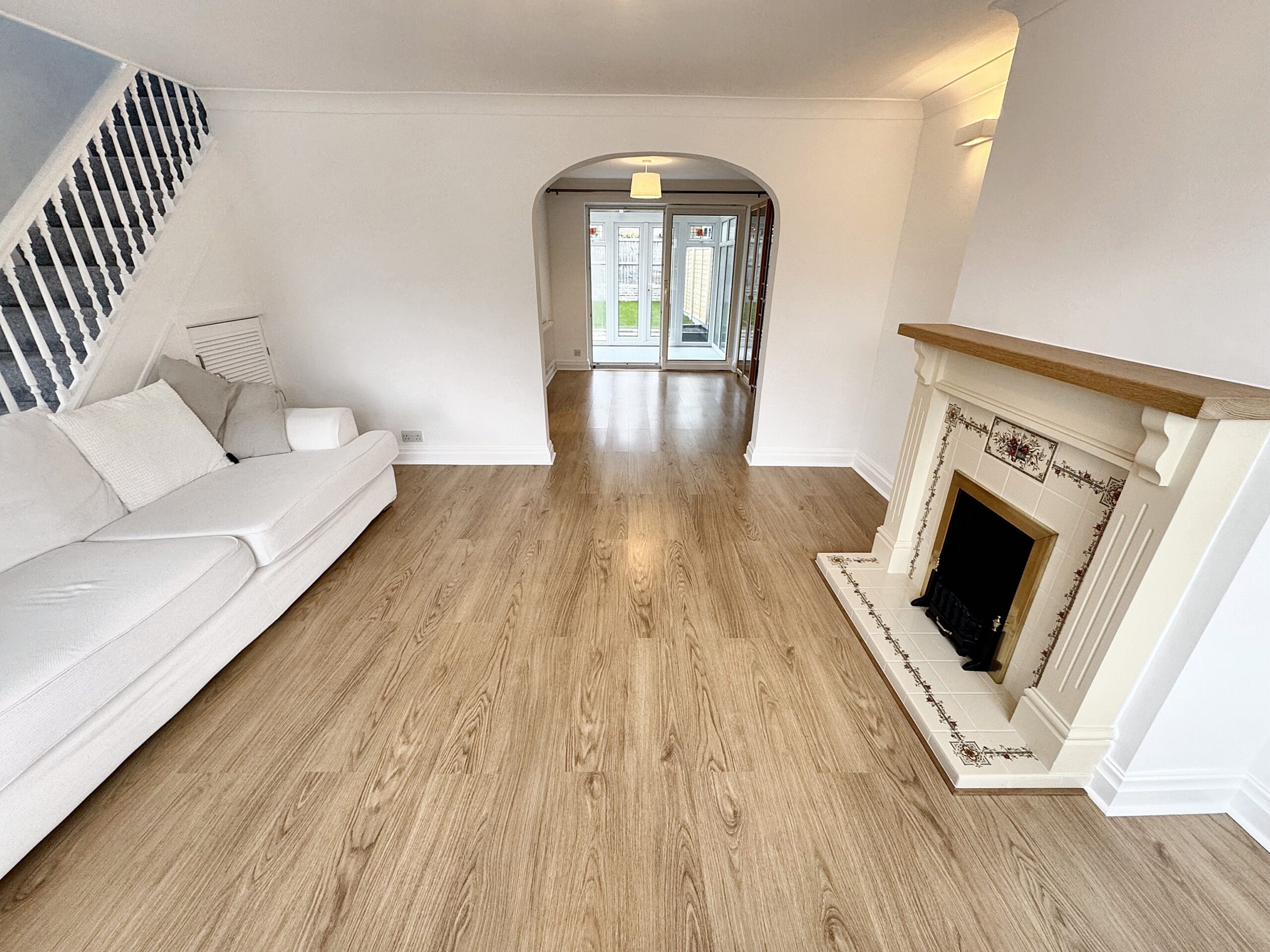 Spacious and light room with UPVC double glazed bay window to front aspect. Radiator. Fireplace. Wood effect flooring. Stairs leading to first floor. Archway leading to dining room.