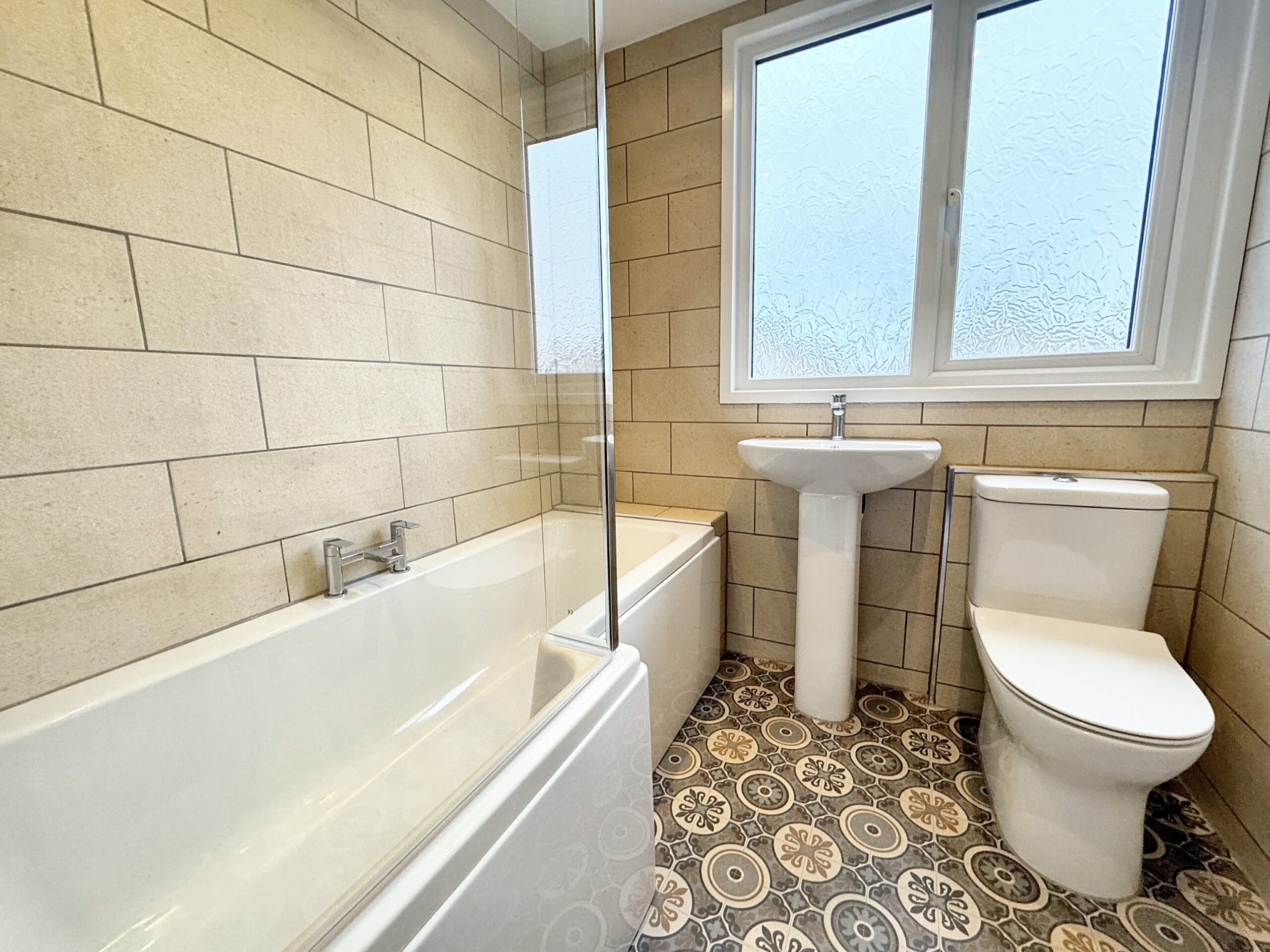 White bathroom suite with sink, WC and shower over bath. Double glazed window to side aspect.