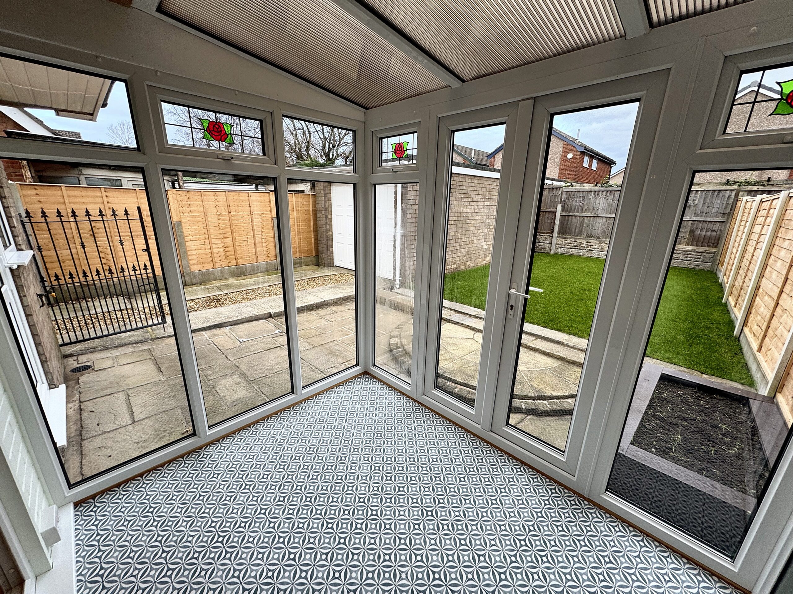Glazed conservatory with double doors leading to patio area and rear garden.