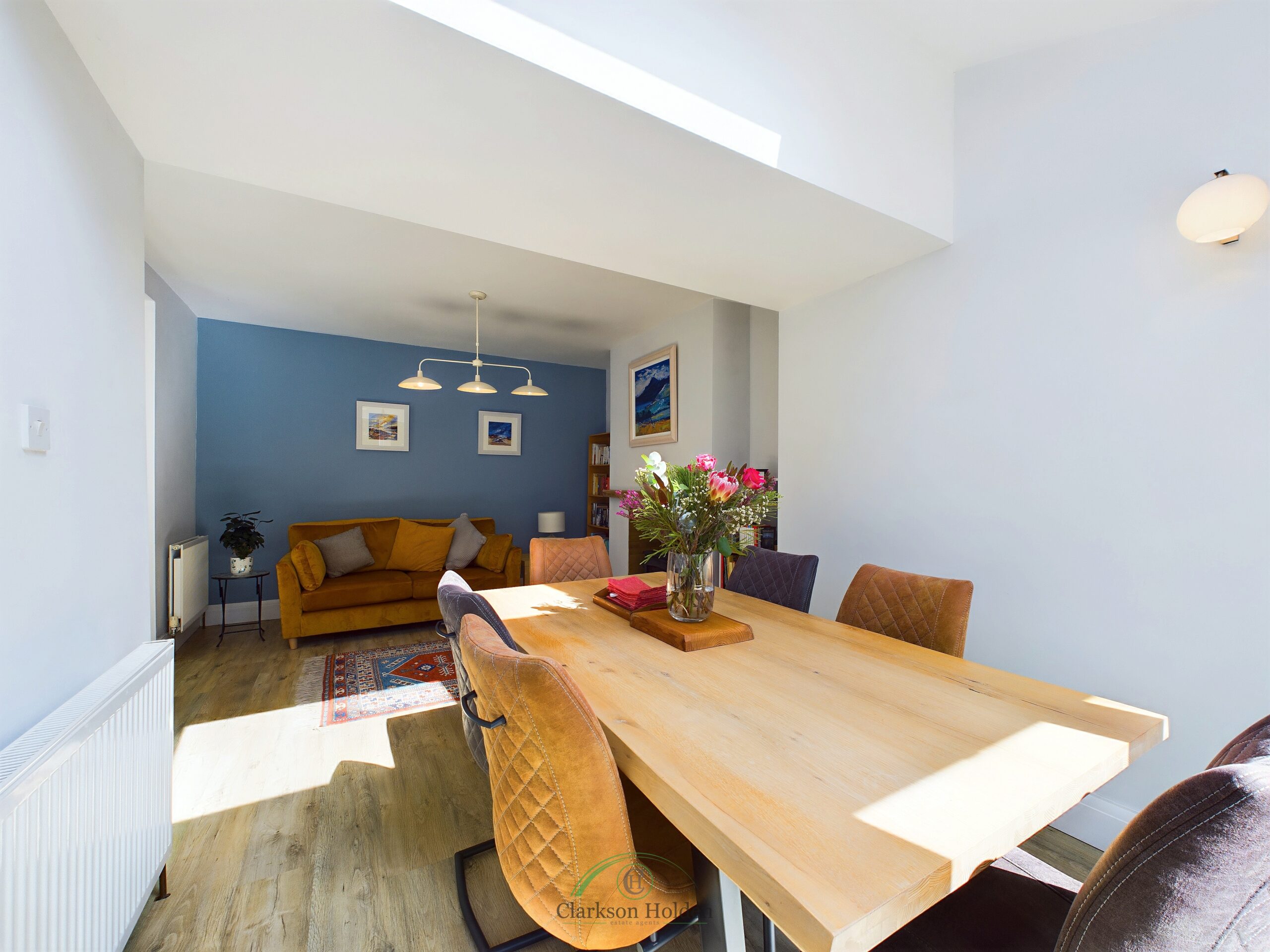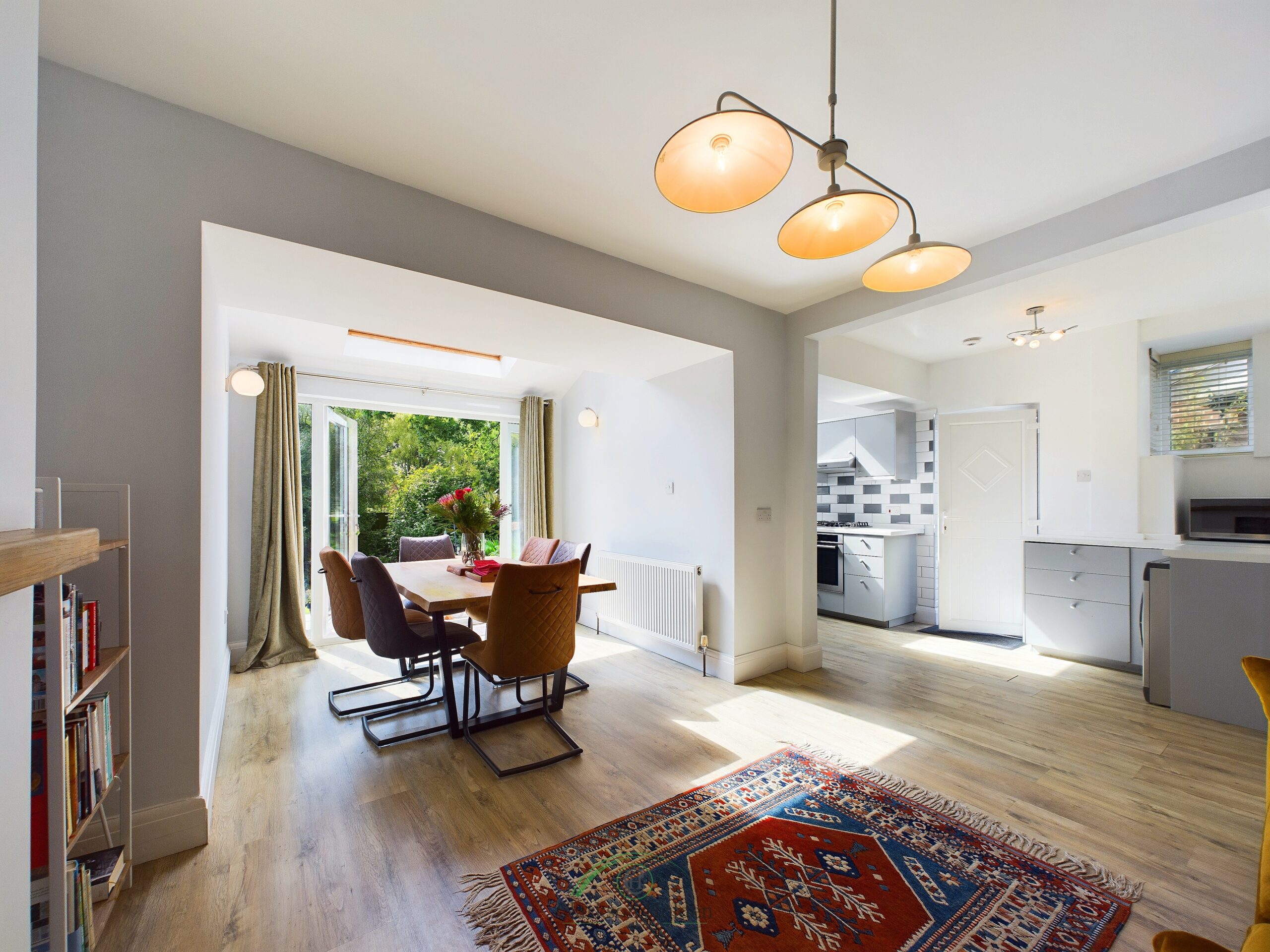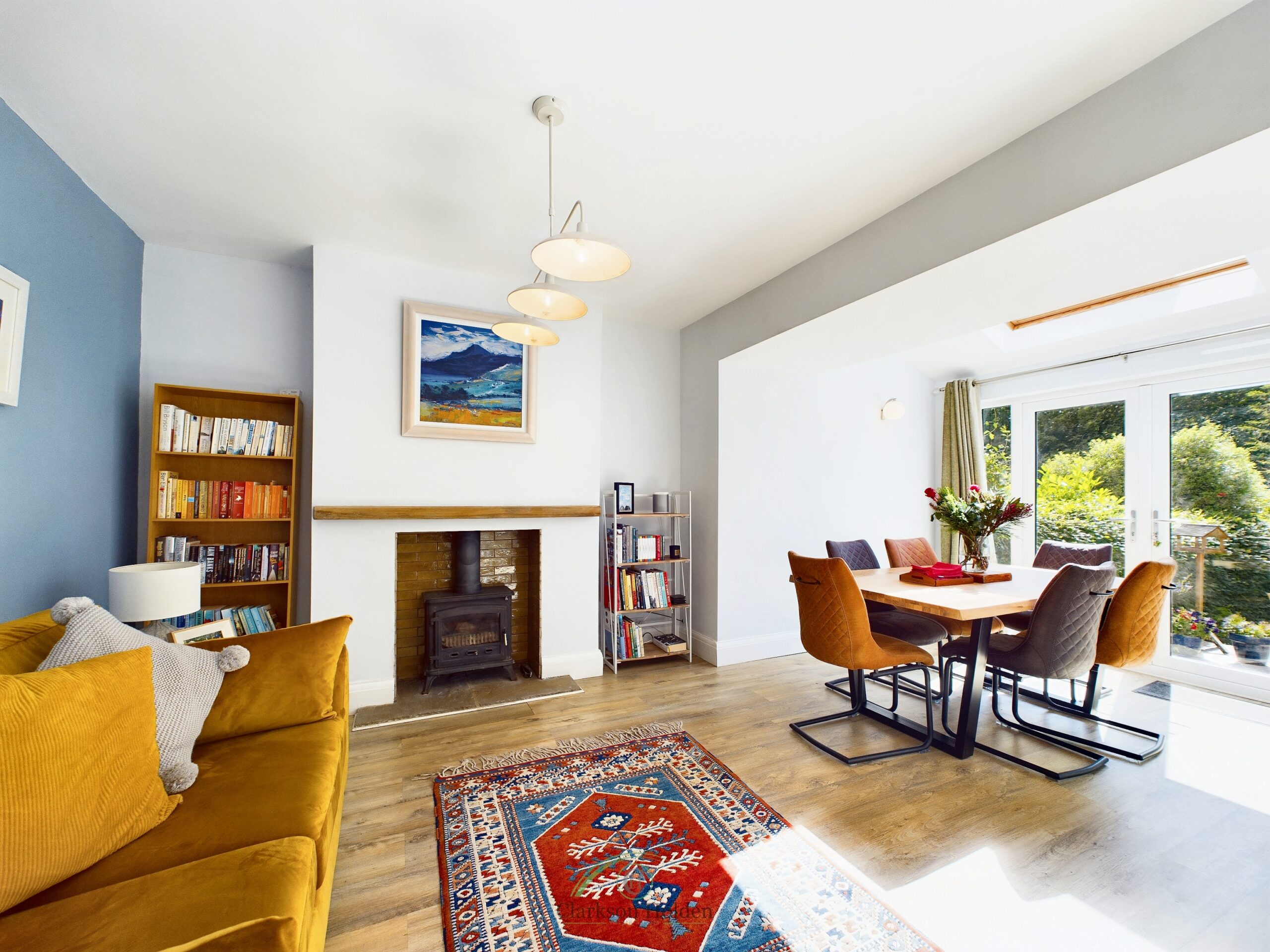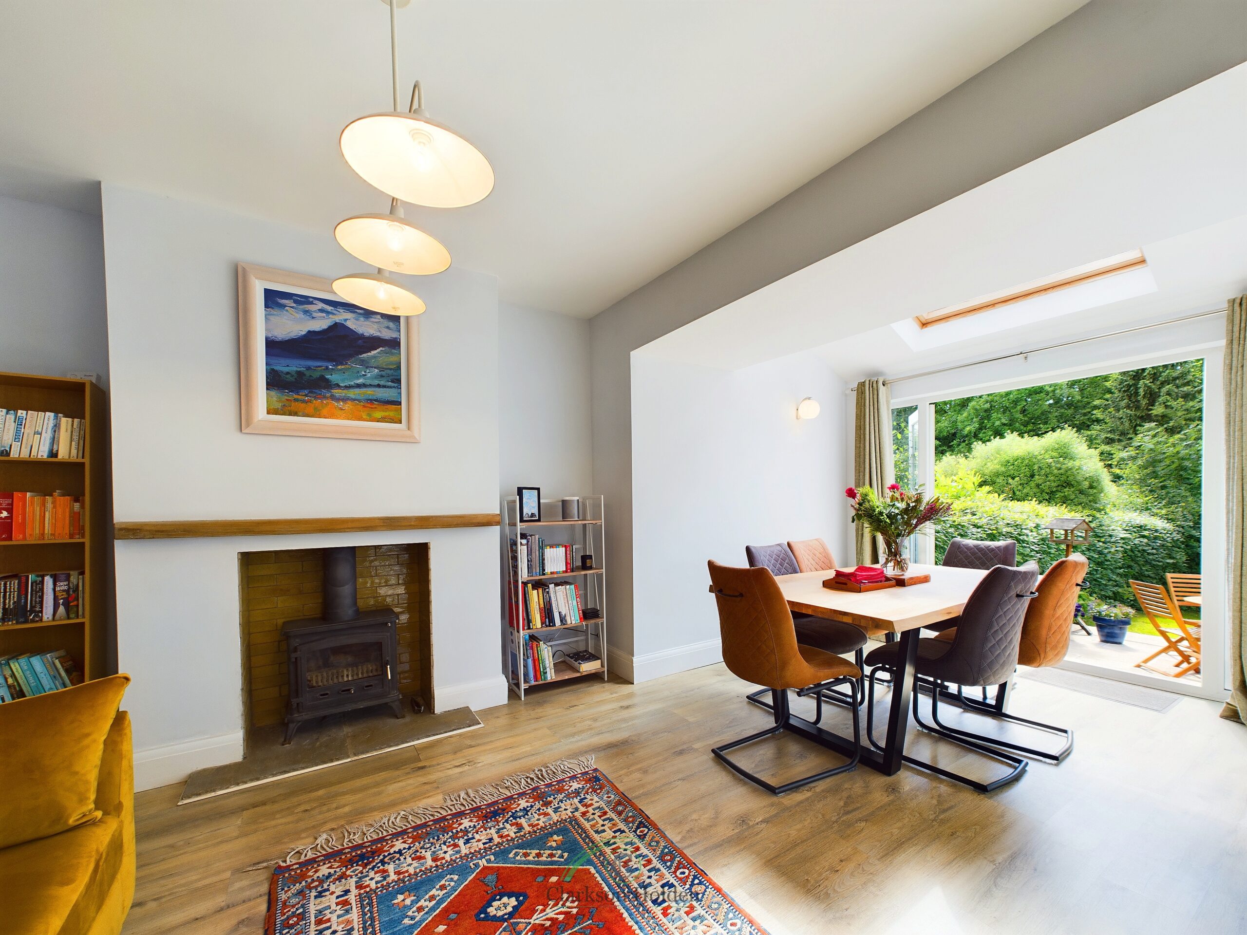 Spacious, light open plan area. Feature fireplace with log burner. Double doors leading to patio. Radiator.