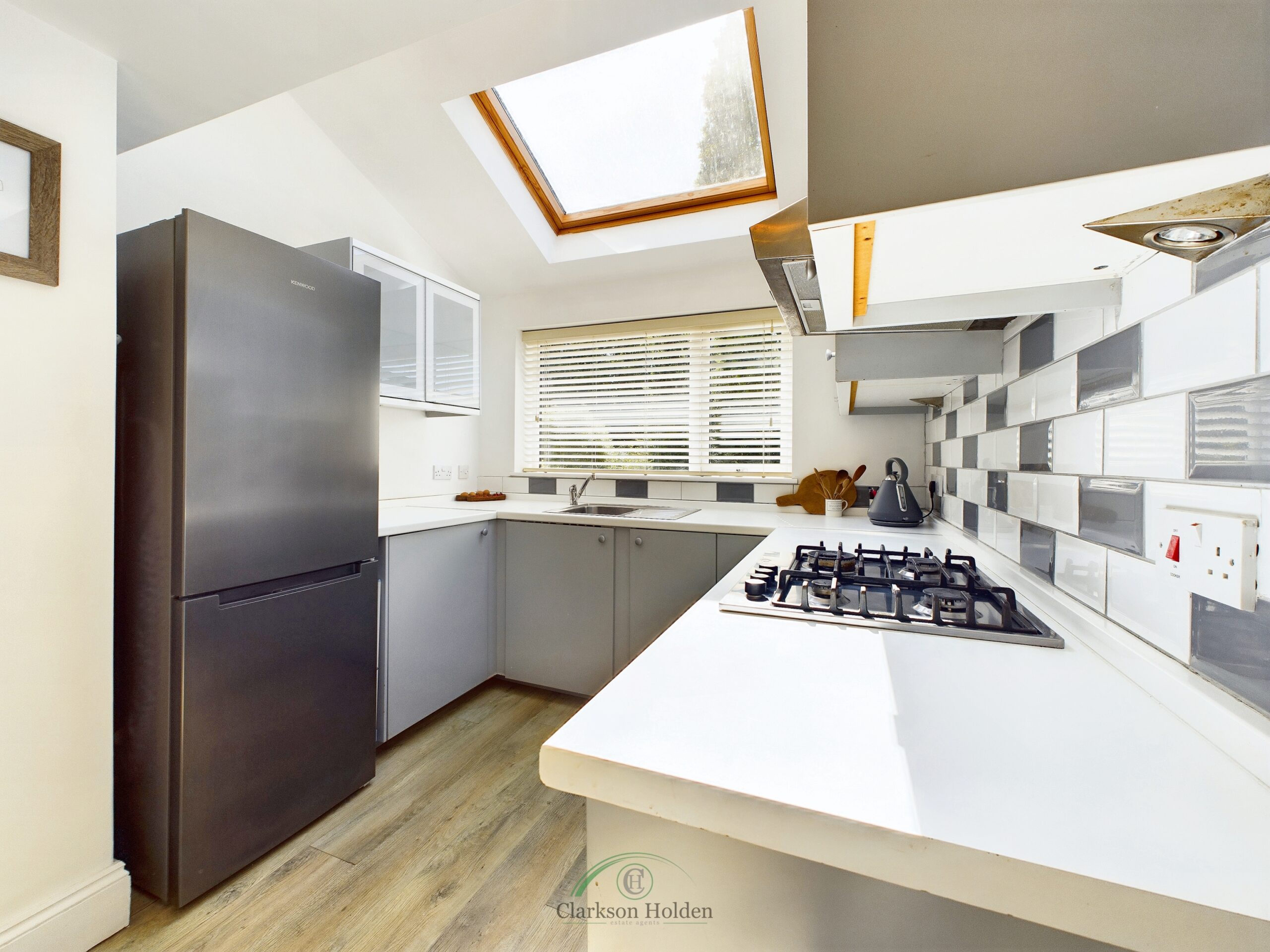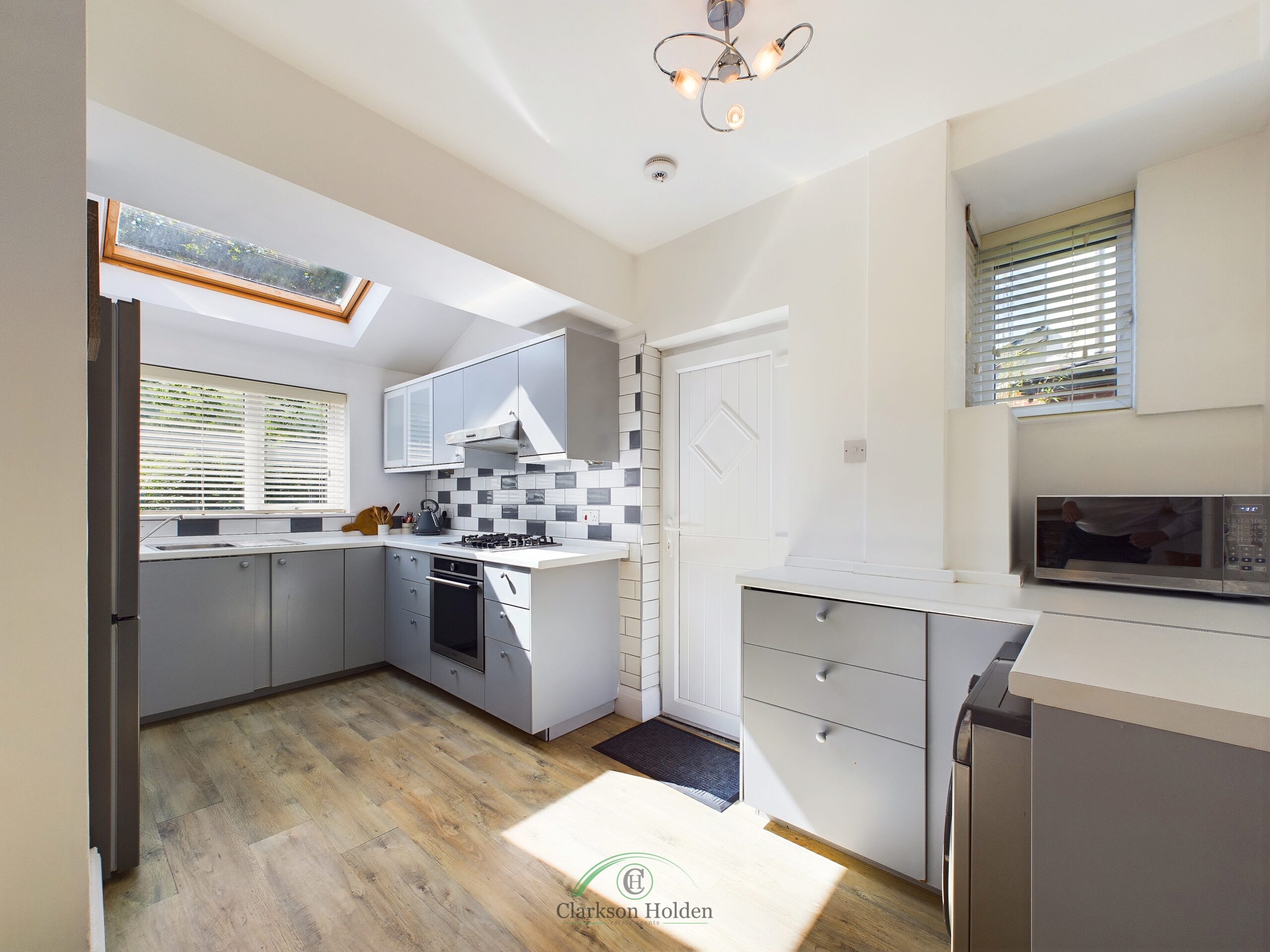 Fitted with floor and wall cupboards. Window to rear aspect and Velux. Door leading out to driveway.