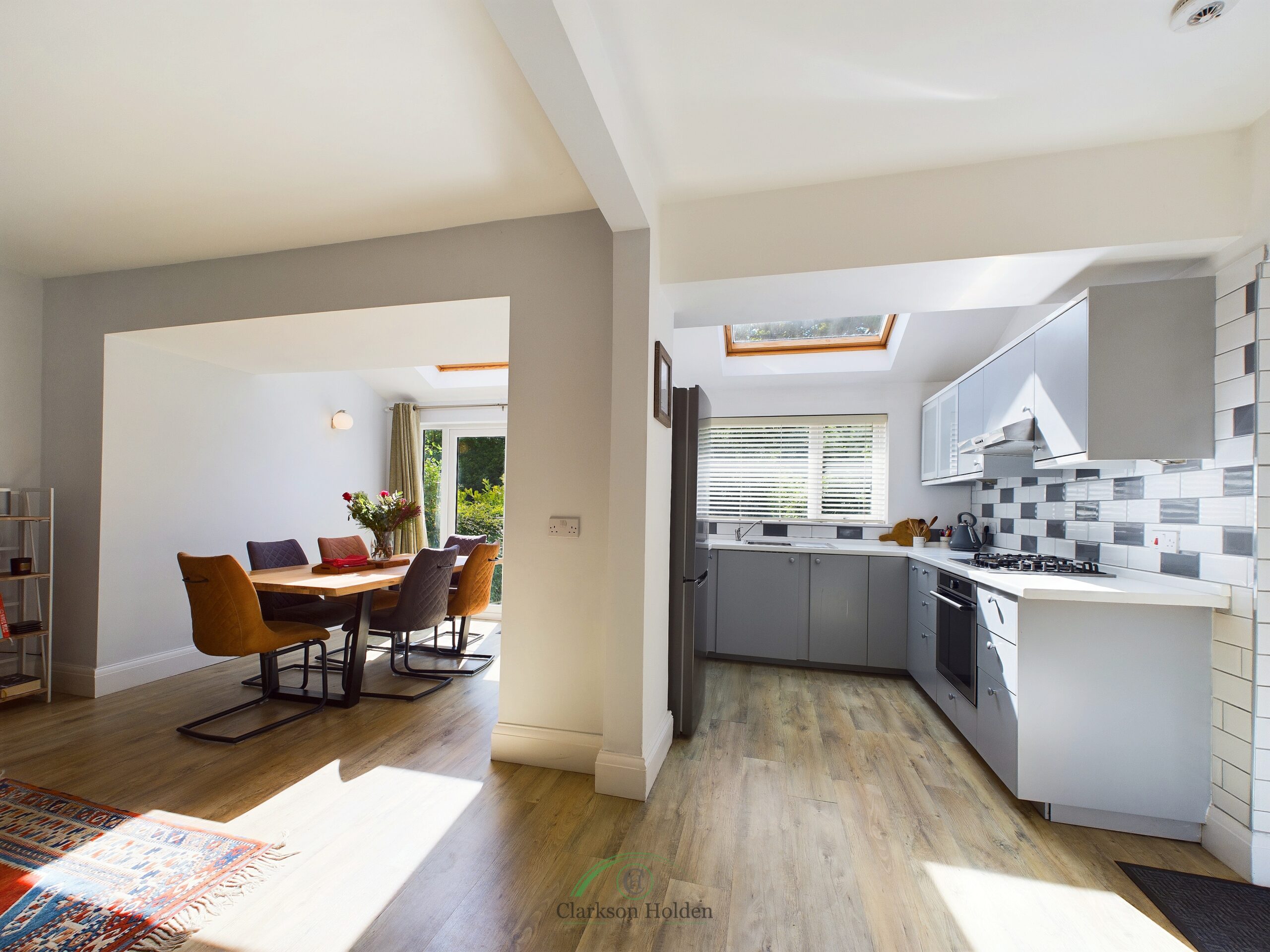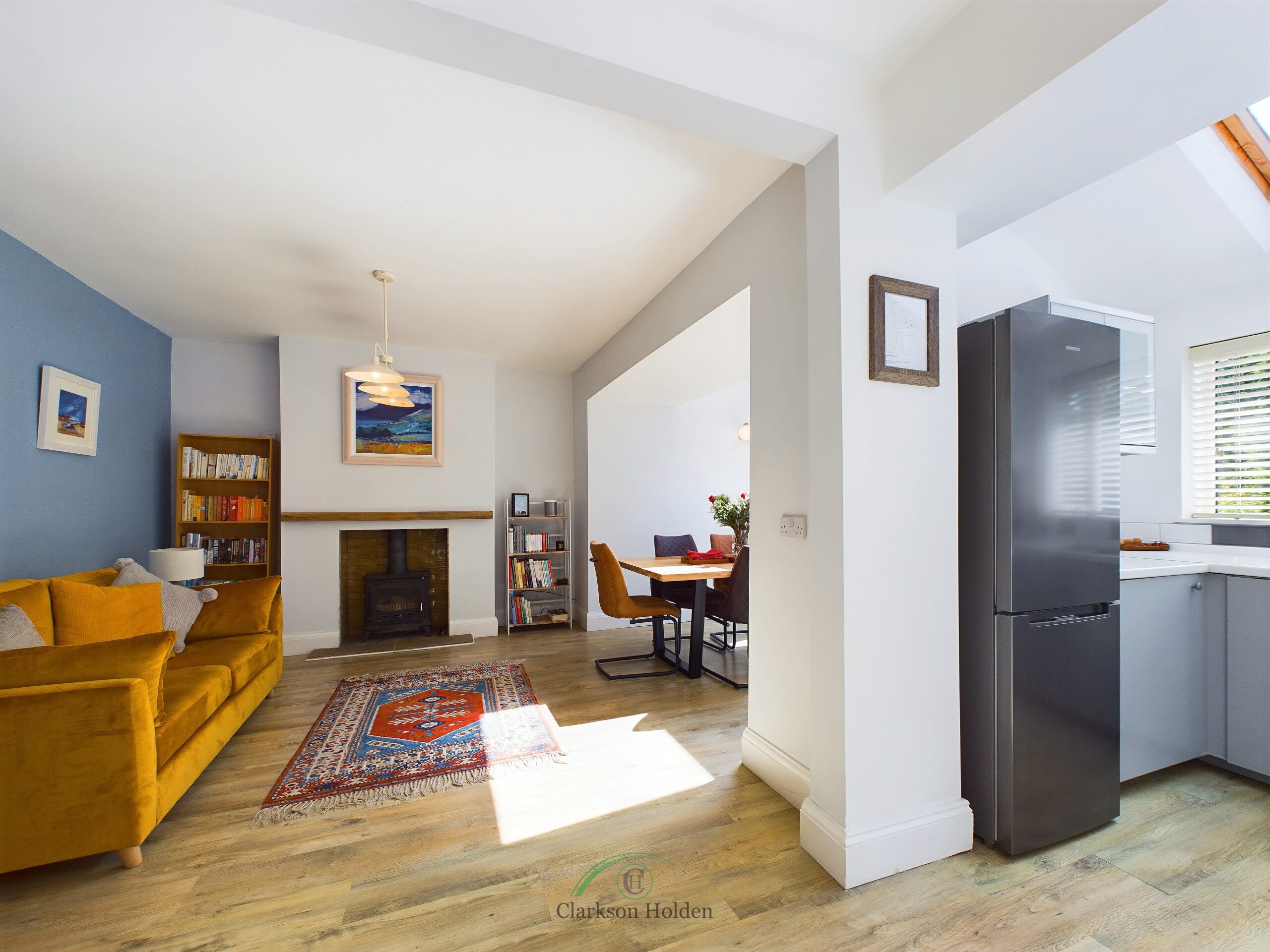 The ground floor features a functional and stylish open kitchen/dining/living area with wood burners in both reception rooms. Downstairs WC. Extended to the rear, with double doors leading to the garden. Double glazed windows throughout. The property maintains attractive feature windows and original wooden internal doors.
