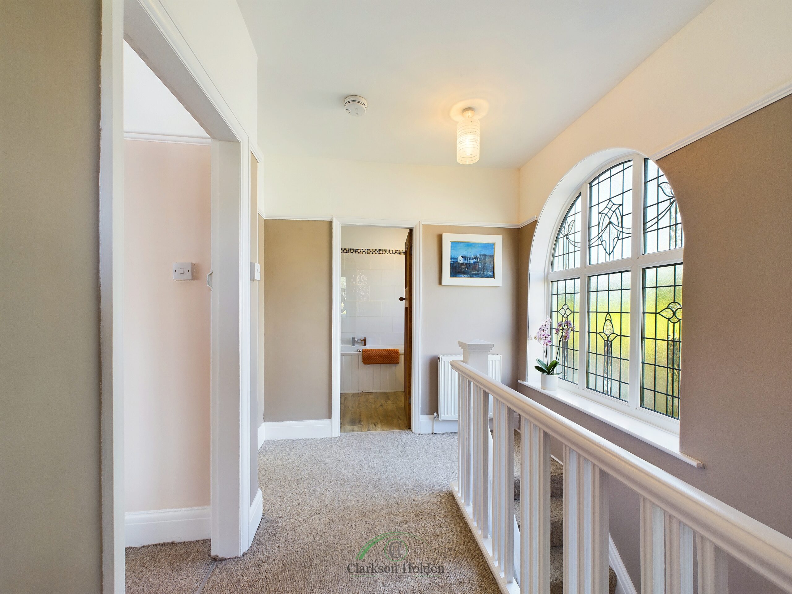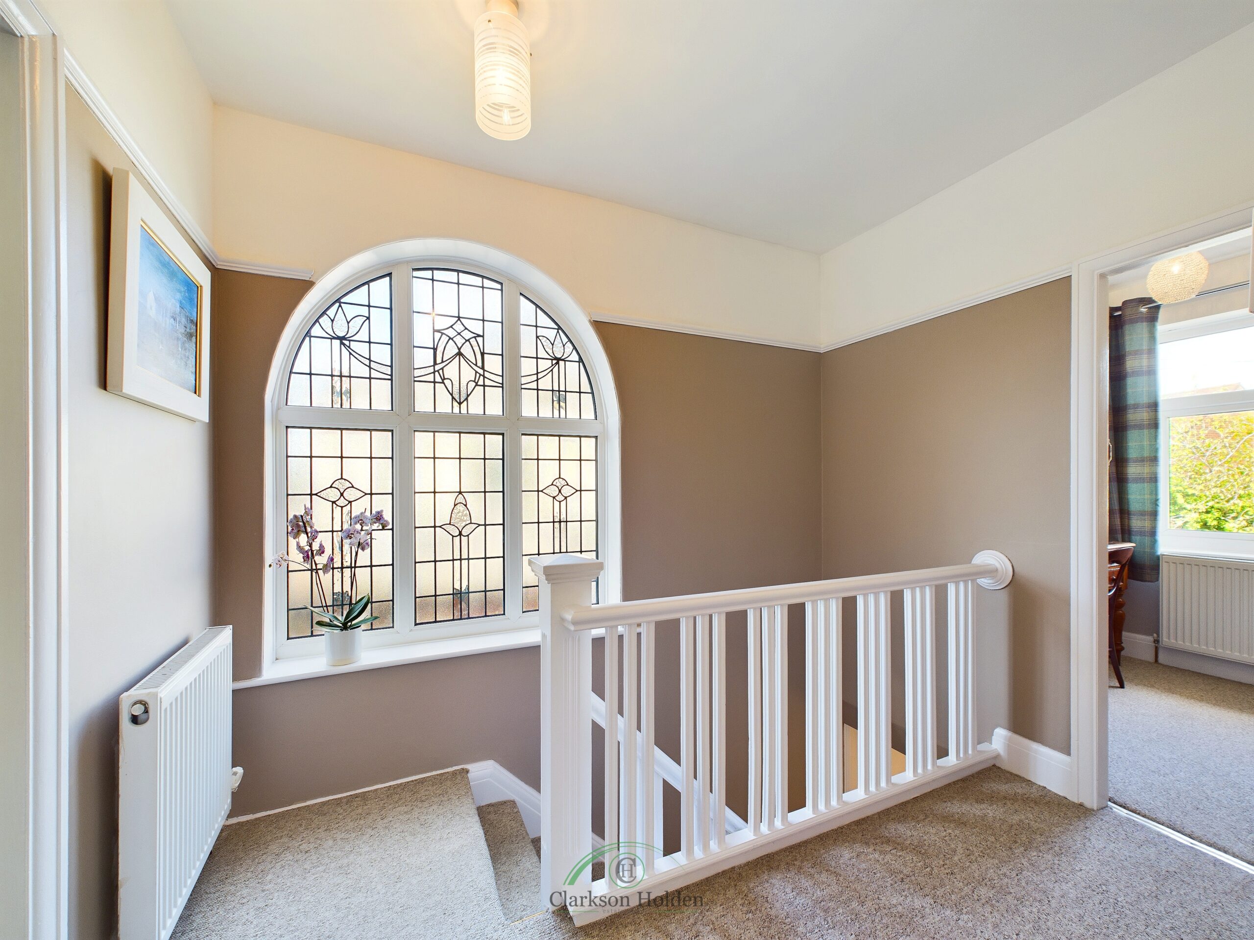 Large, light landing with double glazed arched leaded window to side aspect. Original doors leading to all rooms. Radiator