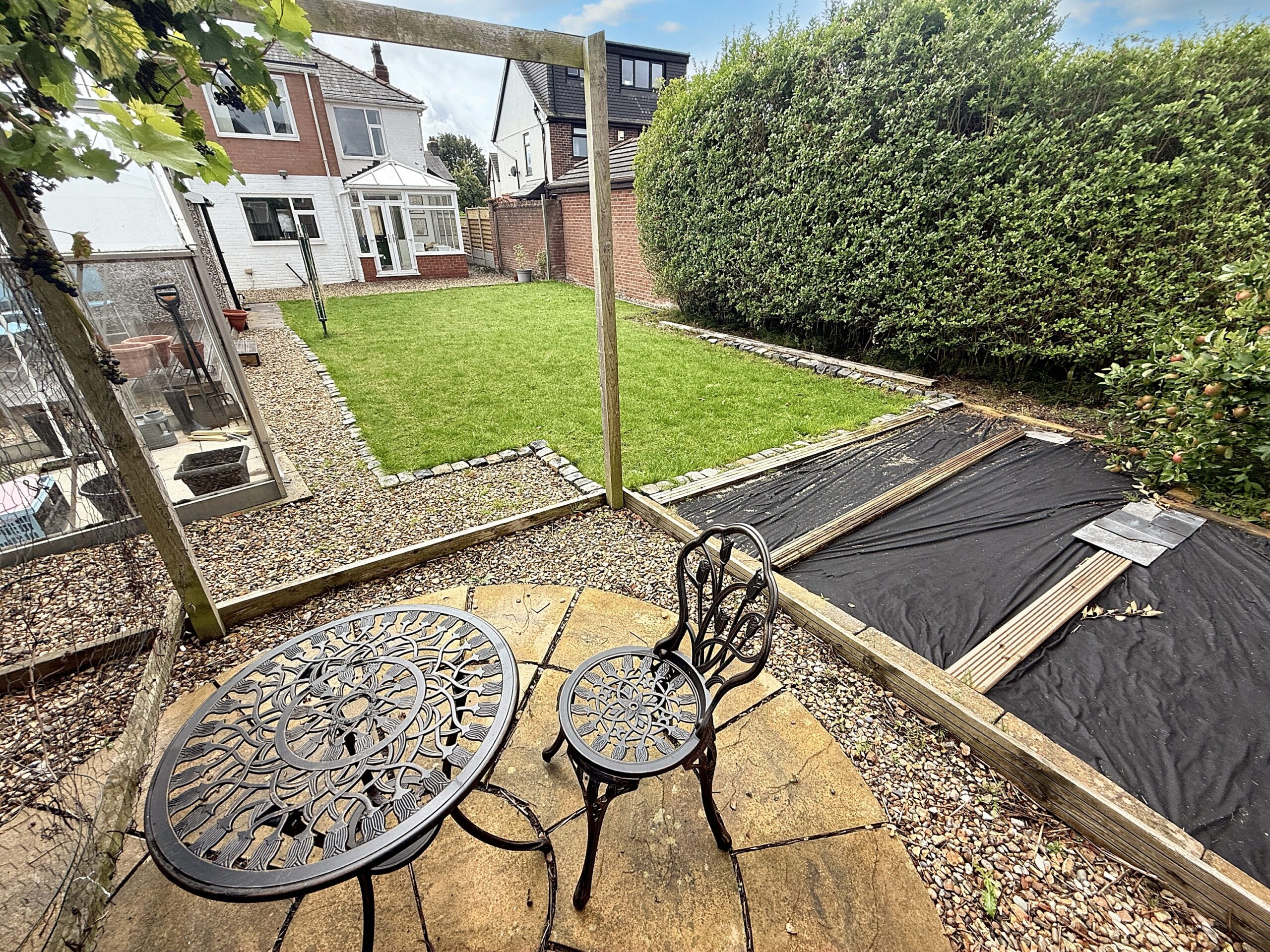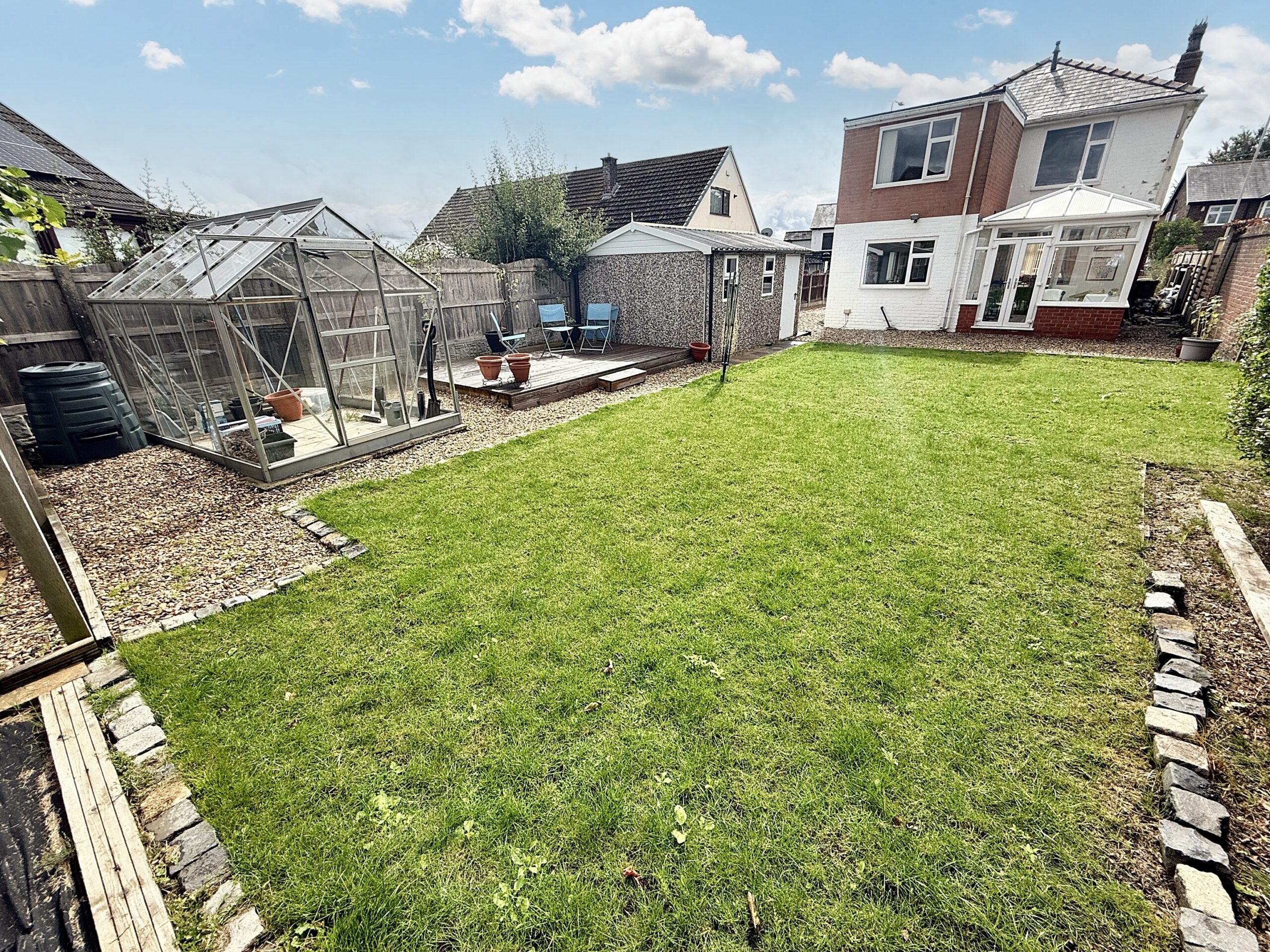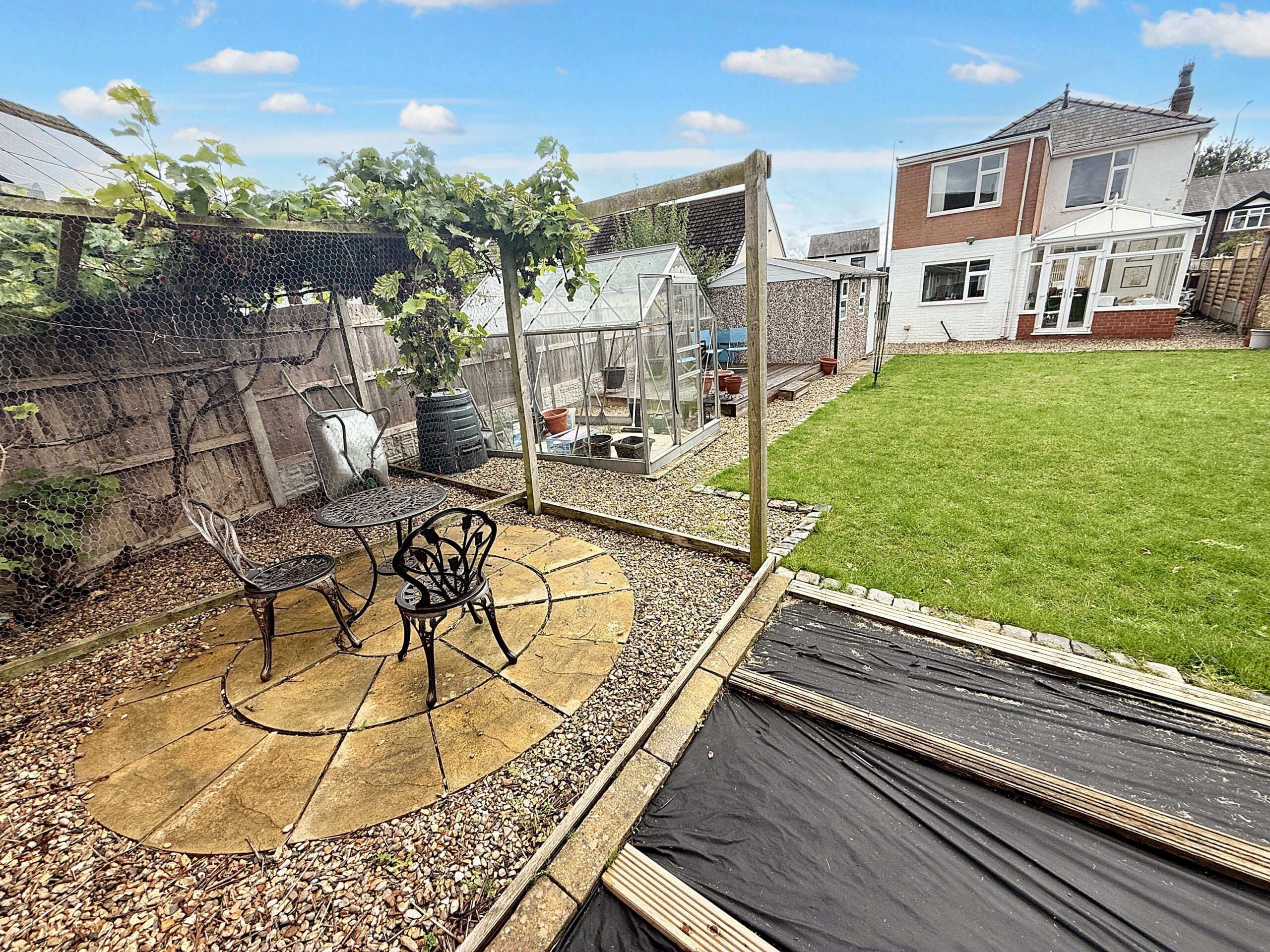 The large rear garden is a gardener's paradise, with a greenhouse and seating area for enjoying the outdoors in style.