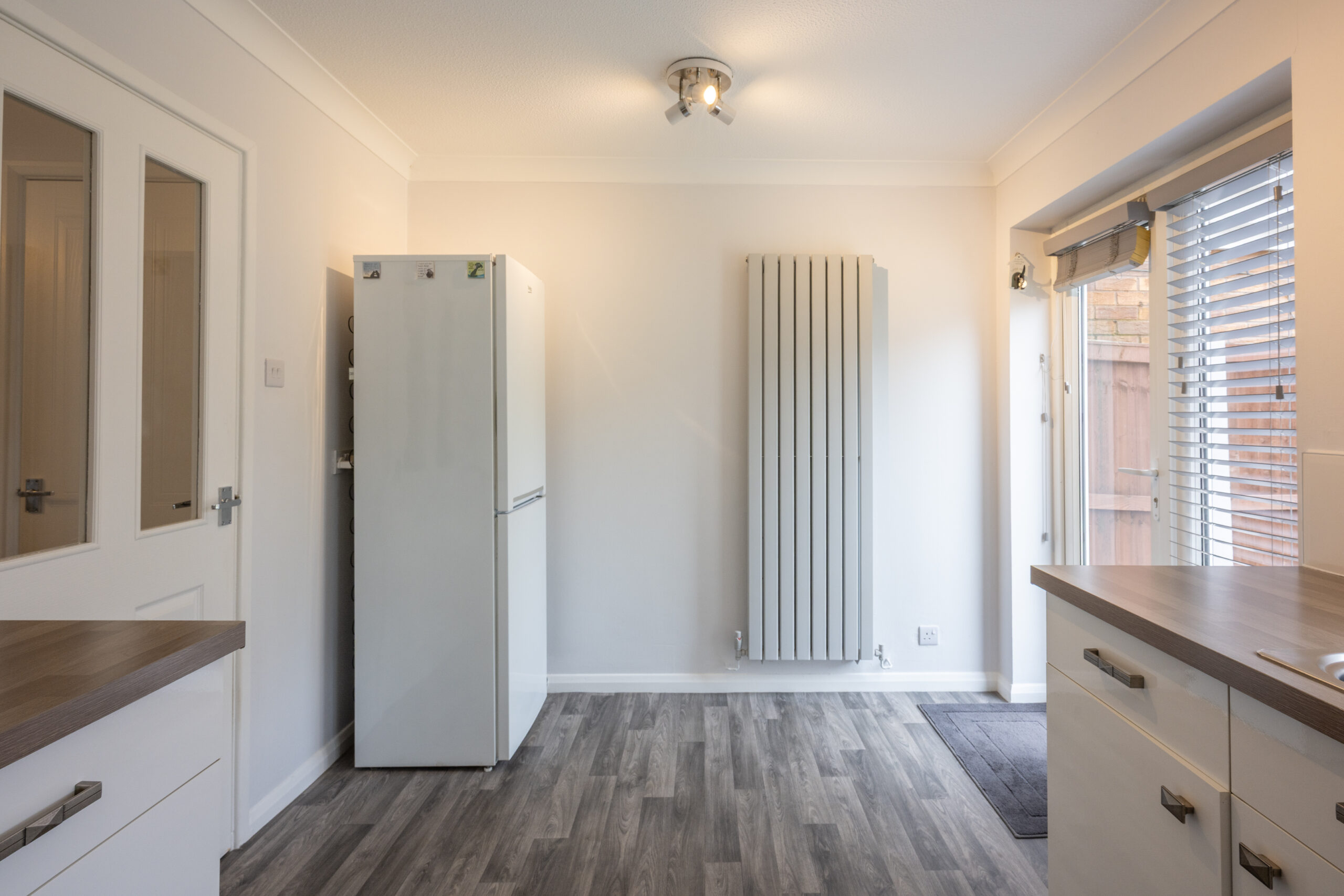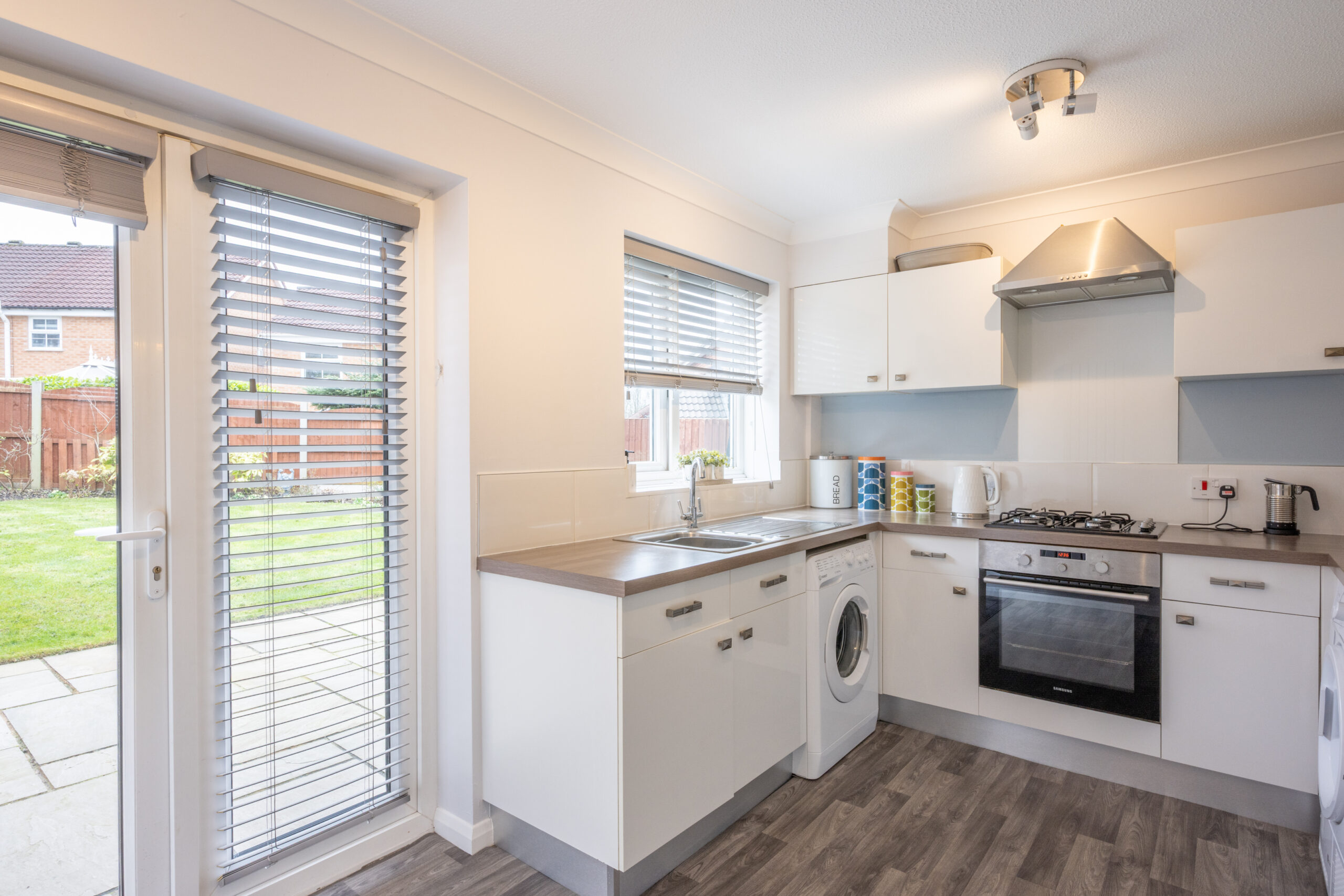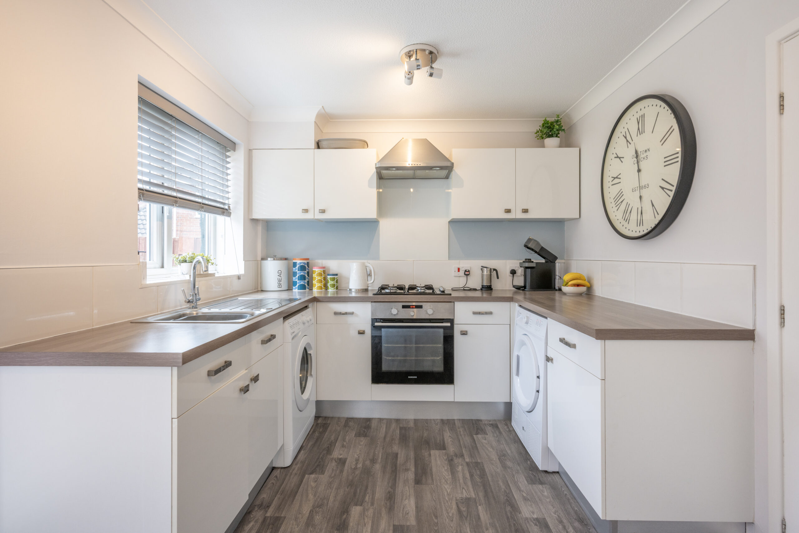 The contemporary kitchen/diner features ample storage and workspace, with plenty of room for a dining table, making it ideal for family meals or hosting friends.